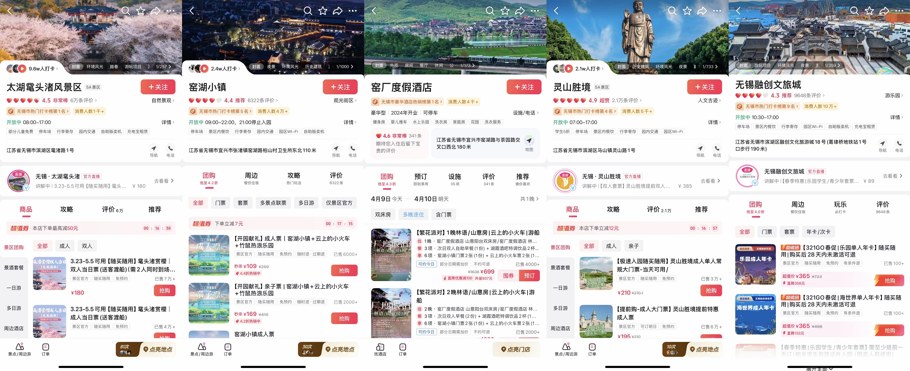 除無錫·拈花灣,太湖黿頭渚、窯湖小鎮(zhèn)、窯廠酒店及靈山勝境同樣表現(xiàn)不俗。太湖黿頭渚通過短視頻種草+達(dá)人直播營銷策略,活動(dòng)期間,投稿視頻近8萬條,開播上千場,在櫻花旺季狂攬超千萬銷售額,穩(wěn)居長三角賞櫻勝地榜首之位;而窯湖小鎮(zhèn)及窯廠酒店作為新入駐抖音生活服務(wù)商家,在此次活動(dòng)中表現(xiàn)亮眼。憑借自身特色與活動(dòng)助力,交易金額突破千萬大關(guān),在活動(dòng)中嶄露頭角。靈山勝境亦充分借助平臺(tái)資源優(yōu)勢(shì), 在活動(dòng)期間投稿超 1.4 萬條,開播近800場,有效帶動(dòng)景區(qū)銷售額相較去年同期飆升 50%,進(jìn)一步夯實(shí)了其在宗教文化旅游領(lǐng)域的標(biāo)桿地位 。