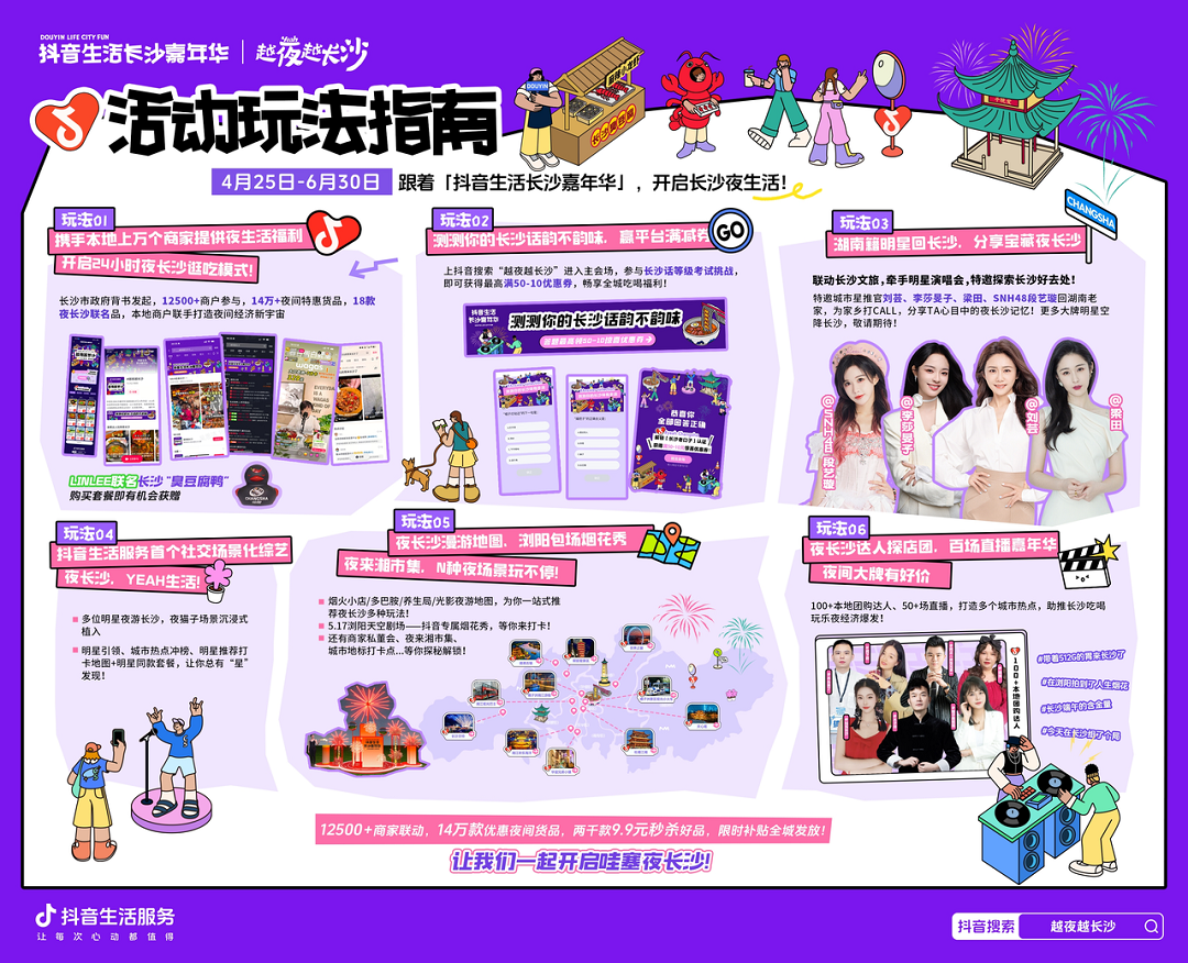 4月25日至6月30日,「抖音生活長沙嘉年華-越夜越長沙」IP活動正在點燃長沙夜晚!這個春夏,抖音生活服務圍繞長沙獨有的文化特色,整合明星陣容、聯(lián)動政府文旅資源,在湘江兩岸鋪開一幅“食、游、購、娛”全景夜生活圖鑒,同步聯(lián)動多領域商家探索消費新場景,實現(xiàn)交易增長。