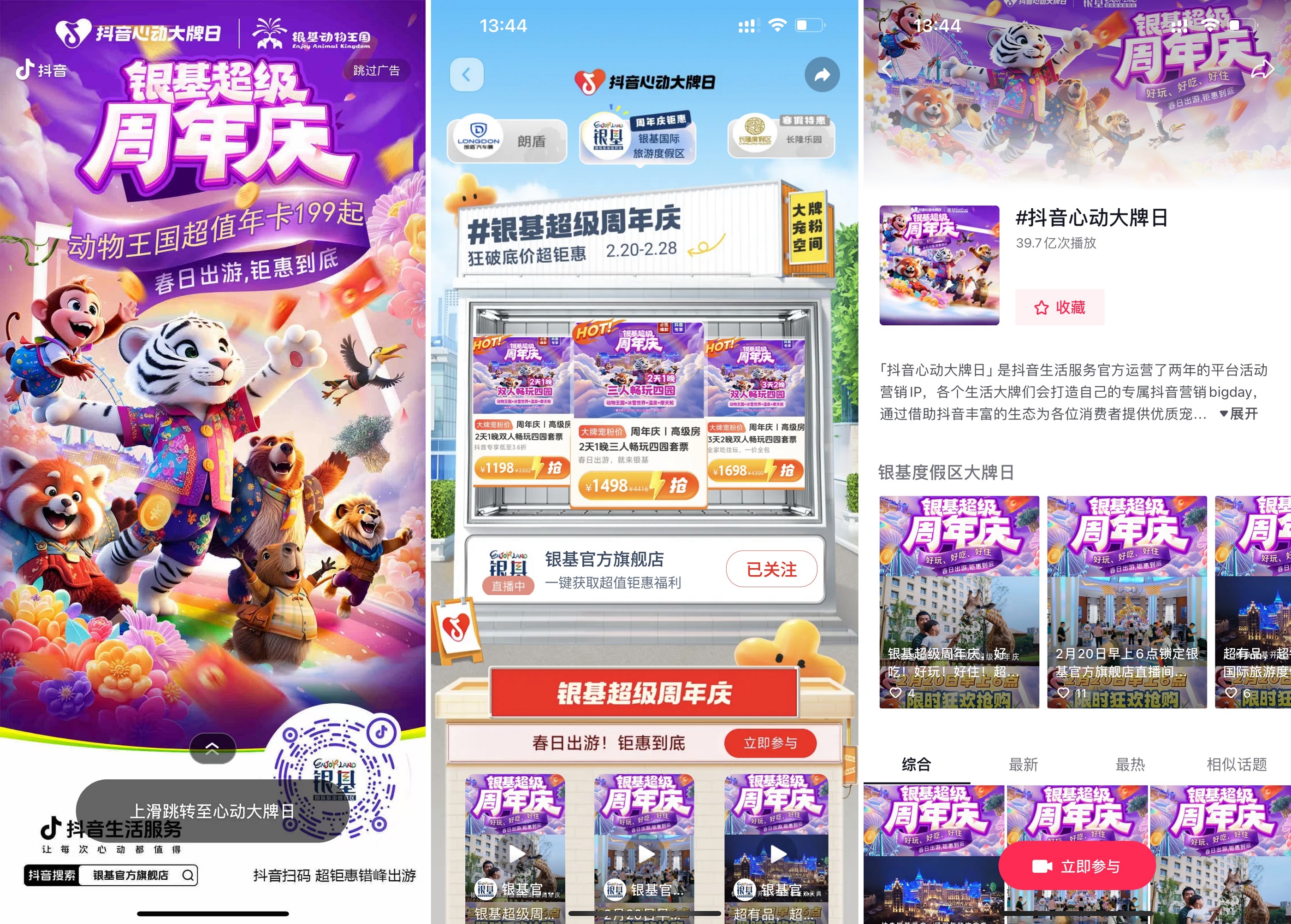 銀基國際旅游度假區(qū)于一年一度的周年慶節(jié)點,攜手「抖音心動大牌日」展開合作,以一場“銀基國際旅游度假區(qū)周年慶”主題活動,打開了廣大用戶春日出游的新思路。憑借年卡鉅惠套餐的豐富選擇、直播狂撒福利的誠意舉措,以及達人共創(chuàng)短視頻的聯(lián)動玩法,銀基國際旅游度假區(qū)在這一關鍵時刻,實現(xiàn)了品牌核心理念的再度探索與深化,促成了周年慶期間客流與口碑的雙豐收。