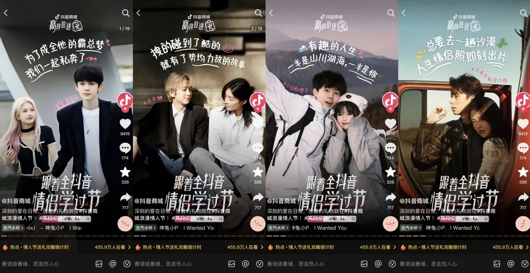 首先一大亮點,是抖音電商巧妙利用情人節(jié)的獨特情感氛圍,邀請情侶達人參與到活動中,創(chuàng)作優(yōu)質(zhì)內(nèi)容,借助情侶之間真摯的情感表達,引起目標受眾的情感共鳴,增強用戶對情人節(jié)送禮文化的認同。