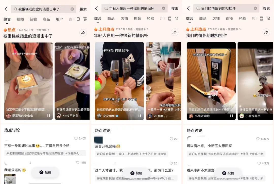 值得一提的是,抖音電商呈現(xiàn)出由趣味性、奇特性與特殊性等類型的小單品引發(fā)熱點趨勢。在# 被蛋糕戒指盒的浪漫擊中了 ,#年輕人在用一種很新的情侶杯、#我們的情侶鑰匙扣掛件等話題推動下,那些給人帶來驚喜與浪漫的小眾禮物引發(fā)了大量關(guān)注。憑借其匠心獨運的小單品,諸多商家在競爭激烈的大促中嶄露頭角,銷量直線上升。