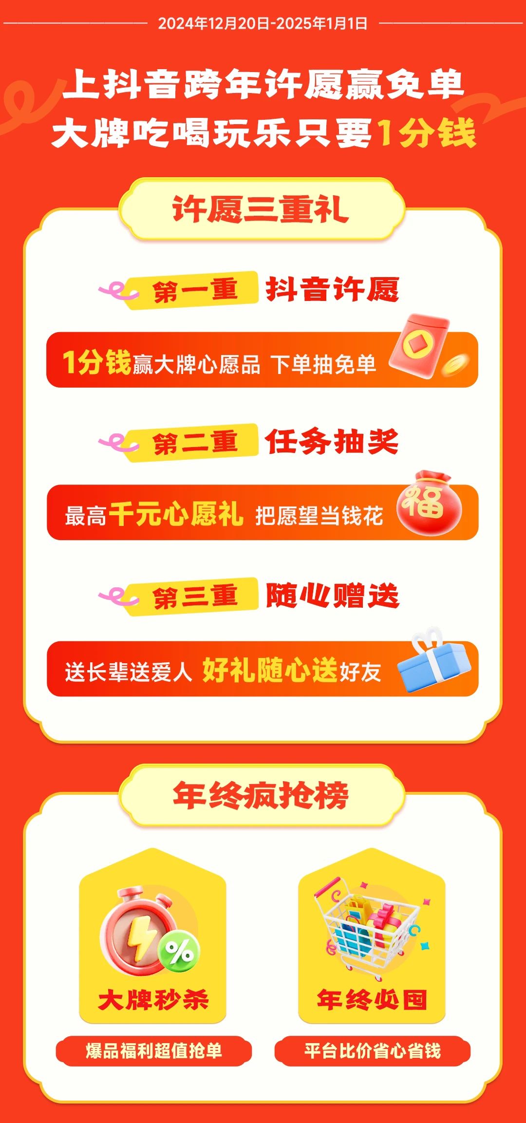 1. 許愿1重禮:上抖音跨年許愿贏免單,大牌吃喝玩樂只要1分錢。