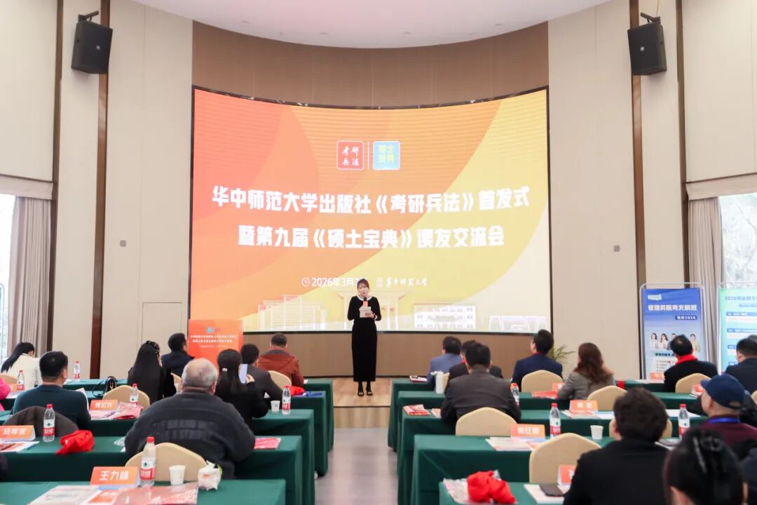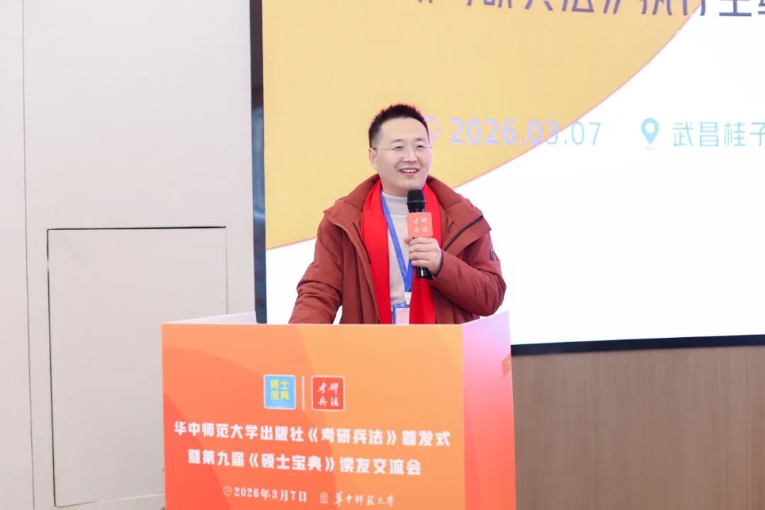 春風(fēng)有約,心向暖陽。2026年3月7日,第九屆《碩士寶典》讀友交流會在華中師范大學(xué)學(xué)術(shù)交流中心成功舉行,來自全國各地的專家學(xué)者、合作伙伴、考研師資班學(xué)員、同仁讀者等60多人共聚一堂,書香相伴,進(jìn)行碩士業(yè)務(wù)交流與項目合作對接,共同謀劃更好地助力考研學(xué)子春季上岸。碩士項目運(yùn)營人、華中師范大學(xué)出版社《考研兵法》主編、《碩士寶典》主編童偉圍繞“決勝之戰(zhàn):2026年春季考研復(fù)試調(diào)劑上岸攻略”的主題,進(jìn)行主旨分享。