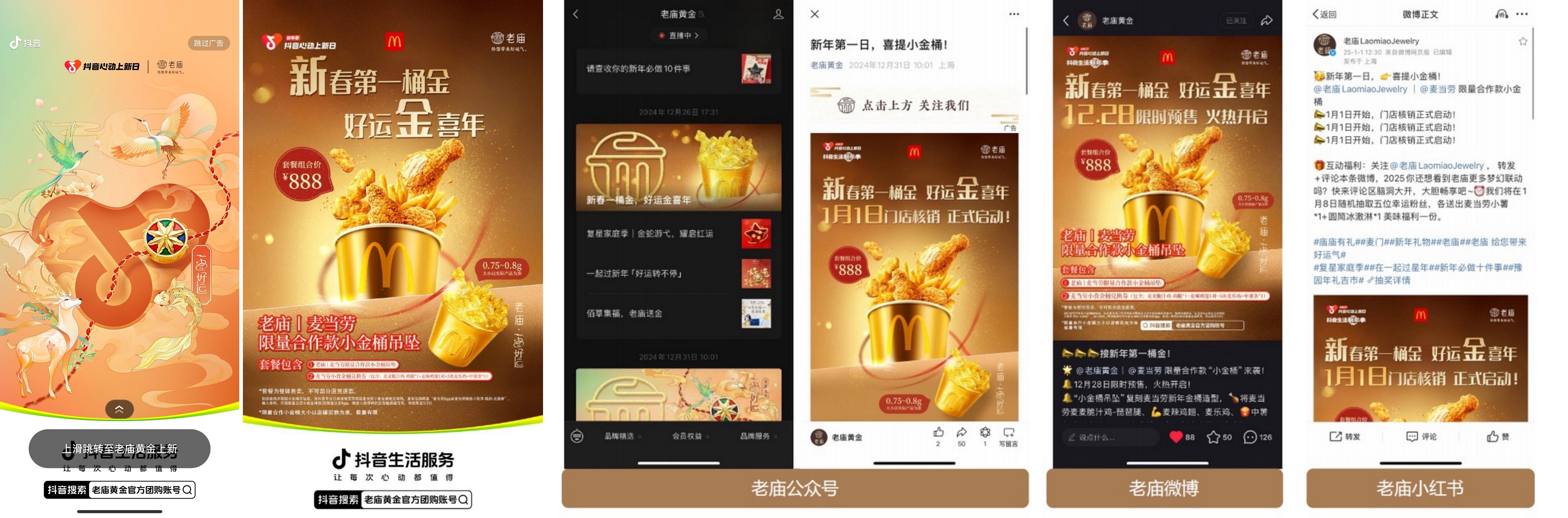 花小錢,買好金,是老廟黃金此次聯(lián)動(dòng)「抖音心動(dòng)上新日」的初衷?;顒?dòng)期間,老廟黃金品牌官方抖音直播間“豪氣”推出了“435代500”、“4350抵5000”等大額優(yōu)惠券,引發(fā)直播間家人們拼手速“瘋搶”,12月24日成就了單場(chǎng)直播GMV破2000萬的佳績(jī),成功刷新了官方賬號(hào)的單場(chǎng)直播GMV記錄。另外,老廟黃金還與麥當(dāng)勞官方直播間驚喜連麥,依托在線趣味游戲互動(dòng)、派發(fā)新品福袋等環(huán)節(jié)持續(xù)渲染跨年歡樂氣氛,吸引大量觀眾涌入直播間參與活動(dòng),共同助力雙品牌聯(lián)動(dòng)套餐售賣突破10000件大關(guān),讓數(shù)萬名幸運(yùn)觀眾穩(wěn)穩(wěn)接住了這份新年好運(yùn)。