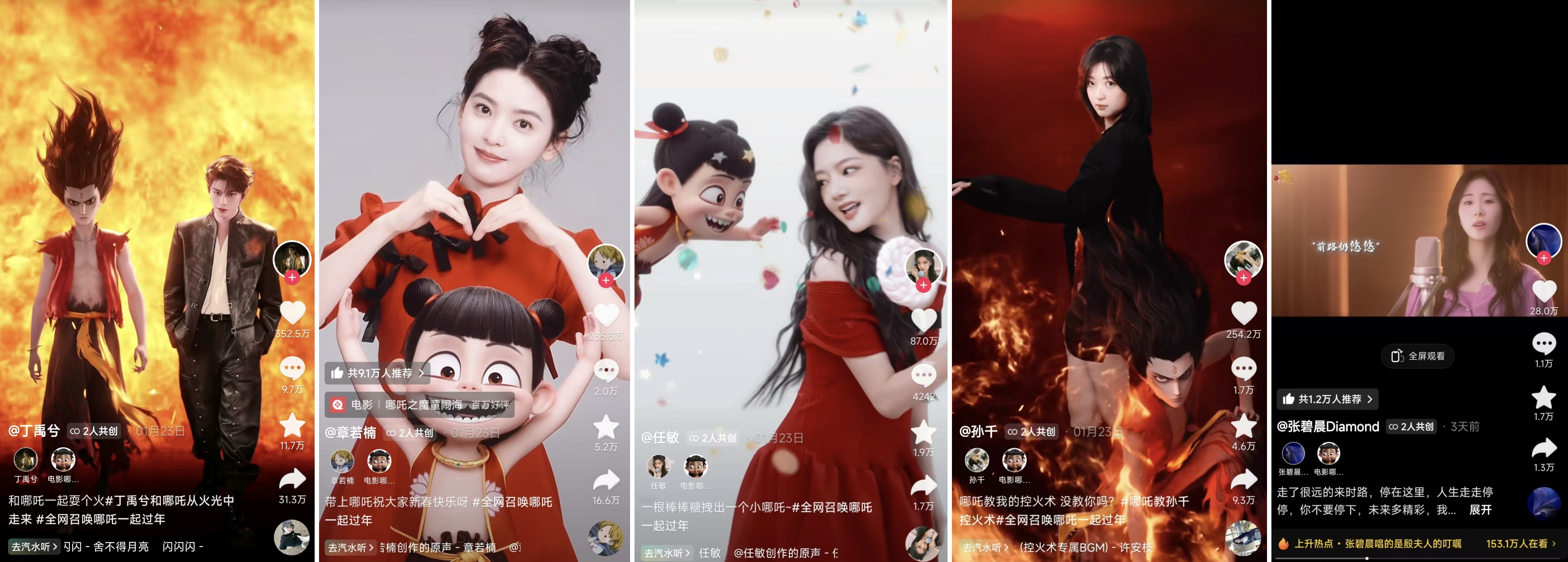 抖音更邀請(qǐng)丁禹兮、章若楠、任敏、孫千、張碧晨等藝人,與哪吒共創(chuàng)情景短視頻,或帥氣酷颯,或可愛溫馨,吸引了大量網(wǎng)友的點(diǎn)贊與分享,進(jìn)一步助推《哪吒之魔童鬧?!窡岫?ldquo;出圈”。