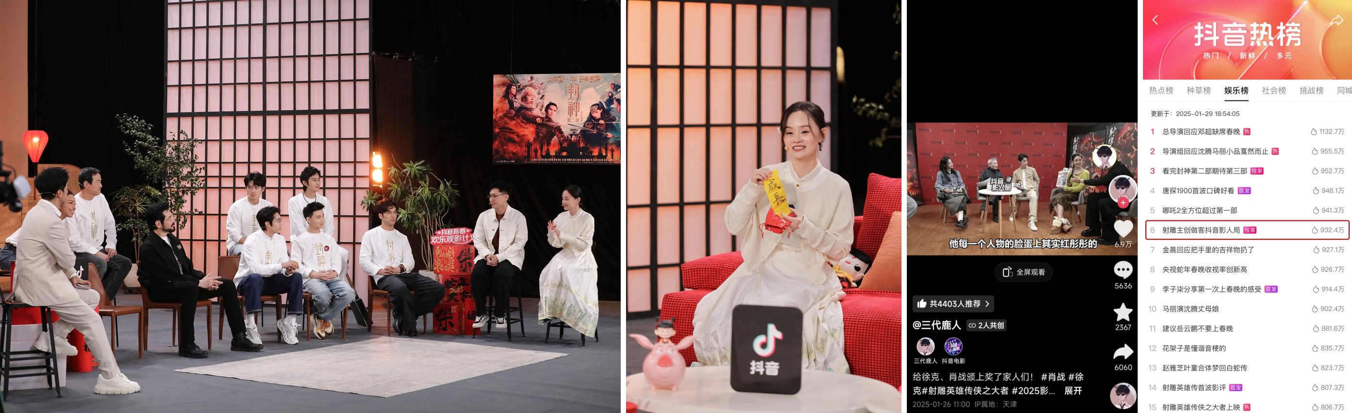 除此之外,抖音電影百評(píng)團(tuán)成員更作為大家的“嘴替”,對(duì)電影主創(chuàng)進(jìn)行了專訪。@婧公子 、@硬核卡子 與《哪吒之魔童鬧?!?、《封神第二部:戰(zhàn)火西岐》主創(chuàng)在直播中展開深度互動(dòng),探究電影背后的創(chuàng)作故事;@三代鹿人 在與《射雕英雄傳:俠之大者》的主創(chuàng)對(duì)談中,向主演展示了抖音網(wǎng)友創(chuàng)作的海報(bào),讓影迷們的心意得以傳達(dá),而#射雕主創(chuàng)做客抖音影人局 也登上了抖音娛樂榜TOP6,進(jìn)一步推動(dòng)電影熱度的增長。