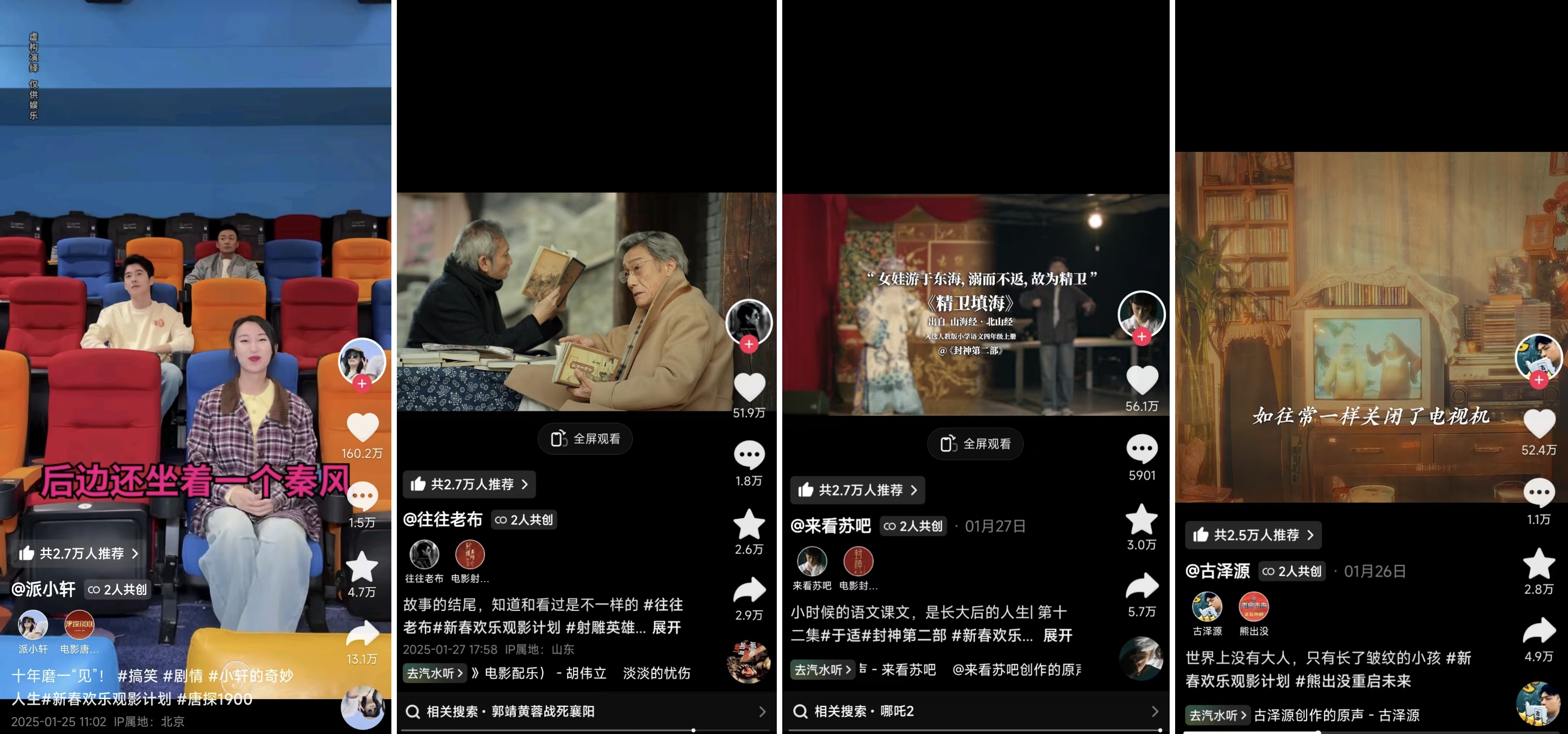 這些共創(chuàng)短片將電影IP融入生活場(chǎng)景,用幽默、情懷與溫情等情緒打動(dòng)用戶,收獲總播放量超2.4億,點(diǎn)贊量1145萬+,單條視頻點(diǎn)贊量均超過了50萬(數(shù)據(jù)截止2月5日)詮釋了“一部電影,千萬種打開方式”。不僅將電影內(nèi)核與觀眾情緒緊密連接,更帶動(dòng)用戶二創(chuàng),反哺影片熱度,形成 “用戶種草——觀影——二次創(chuàng)作”的正向循環(huán)。在抖音,電影從不散場(chǎng),每個(gè)人都是續(xù)寫故事的導(dǎo)演。
