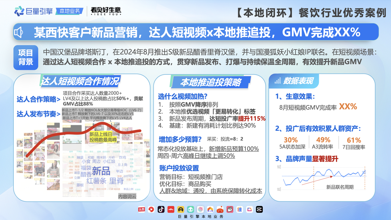 今年8月,塔斯汀推出重磅新品“醋香里脊?jié)h堡”,并與國漫大IP“狐妖小紅娘”聯(lián)名。根據(jù)這樣的營銷基礎(chǔ),塔斯汀在抖音營銷策略上采取了“達(dá)人+本地追投”模式,合作多等級優(yōu)質(zhì)達(dá)人 2000+,實現(xiàn)全面覆蓋和精準(zhǔn)觸達(dá)目標(biāo)受眾,同時圍繞視頻加熱、預(yù)算分配、投放設(shè)置,針對性制定了本地推追投策略,高效利用資源,廣泛覆蓋潛在客戶,提升投放效果。
