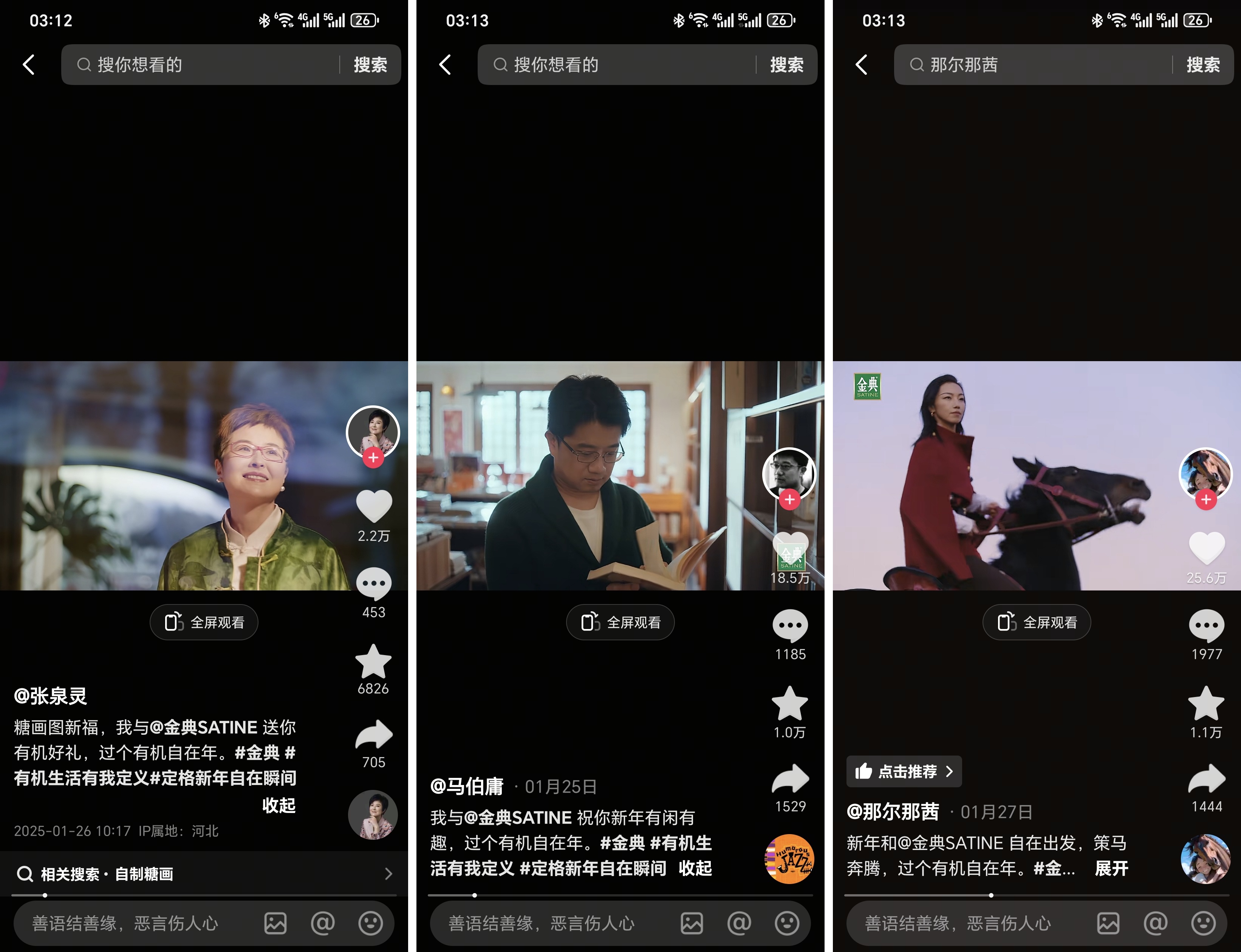 此次合作中,金典通過(guò)巨量星圖邀請(qǐng)了三位來(lái)自不同領(lǐng)域的達(dá)人——張泉靈、馬伯庸、那爾那茜。他們以各自獨(dú)特的視角與風(fēng)格,呈現(xiàn)出春節(jié)的多樣面貌。