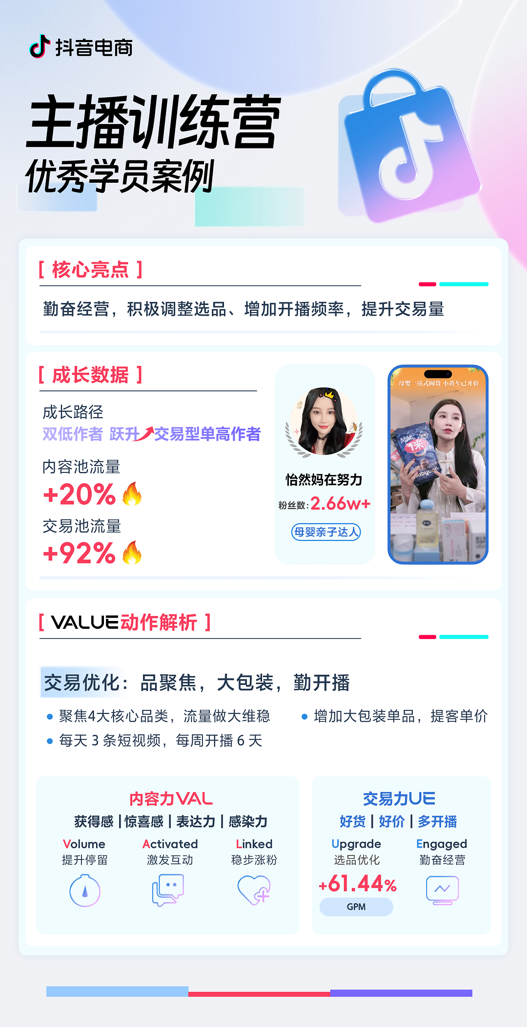 近期,抖音電商主播訓(xùn)練營啟動,依托VALUE作者經(jīng)營方法論,高達78.5%的學(xué)員實現(xiàn)了經(jīng)營指標的顯著提升,在內(nèi)容力與交易力上實現(xiàn)了質(zhì)的飛躍。抖音電商主播訓(xùn)練營是什么?為什么能實現(xiàn)如此顯著的成效?原來,今年抖音電商平臺調(diào)整了流量分配算法規(guī)則,每個作者發(fā)布的內(nèi)容,可以同時在內(nèi)容場和交易場實現(xiàn)曝光轉(zhuǎn)化。由此,內(nèi)容力和交易力成為抖音電商作者成長的兩大飛輪。為了助力更多作者抓住機遇,高效利用內(nèi)容場與交易場的流量紅利,加速業(yè)務(wù)成長步伐,抖音電商潛力作者主播訓(xùn)練營計劃啟動,為參訓(xùn)者提供系統(tǒng)性的內(nèi)容創(chuàng)作與交易轉(zhuǎn)化指導(dǎo)。本文將精選幾位典型代表,旨在為更多創(chuàng)作者提供“雙高”成長方式和路徑的靈感。