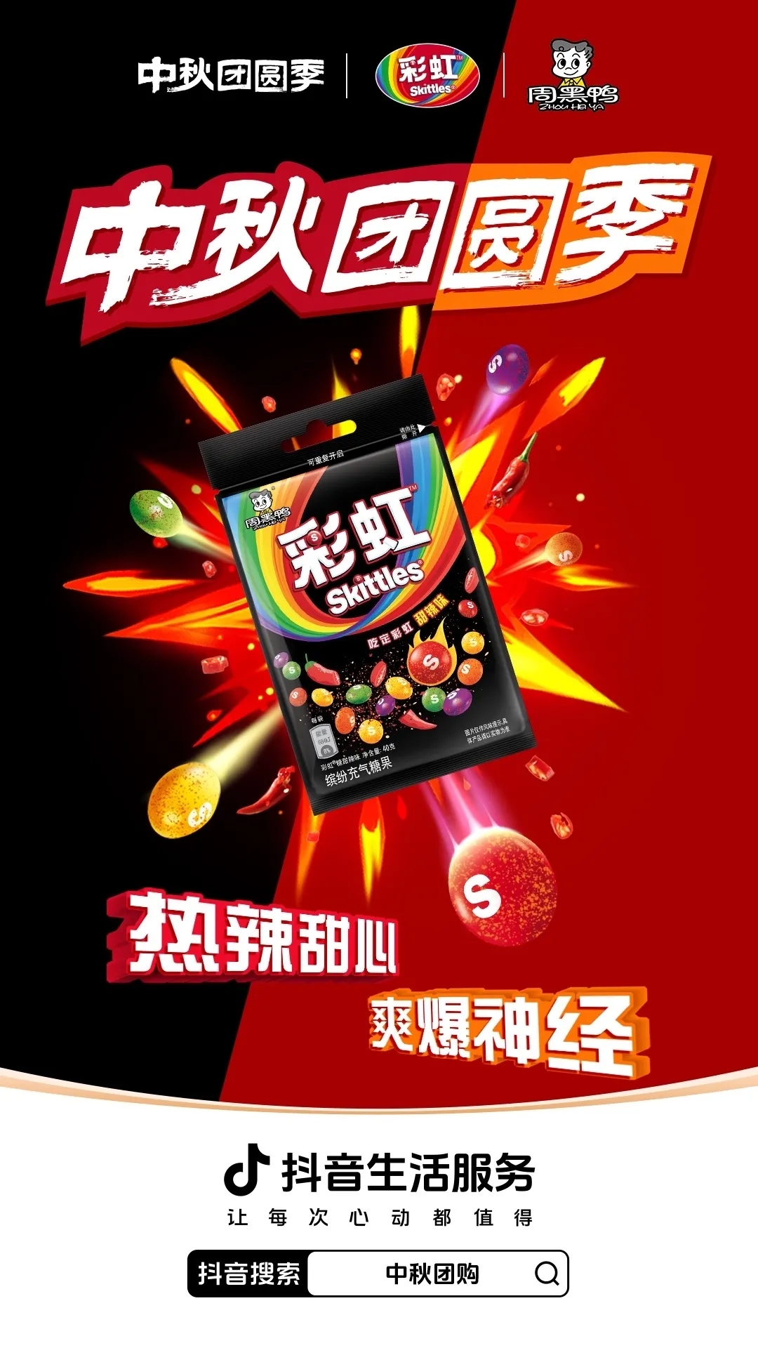 這次,在抖音生活服務(wù)「中秋團圓季」,彩虹糖與周黑鴨組成CP,推出“熱辣甜心,爽爆神經(jīng)”的組合新品,帶來甜辣兼?zhèn)涞莫毺匚独儆洃洝3藙葜星锎蟠?,?lián)名套餐上架至活動的團購頁面,在平臺公共流量的助力下,用戶在購買中秋應(yīng)季貨品的同時,也被這款玩趣“食”足的跨界新品吸引,“邊看邊買”自然帶動彩虹糖和周黑鴨的雙贏轉(zhuǎn)化成績,達成“1+1>2”的種草效果。