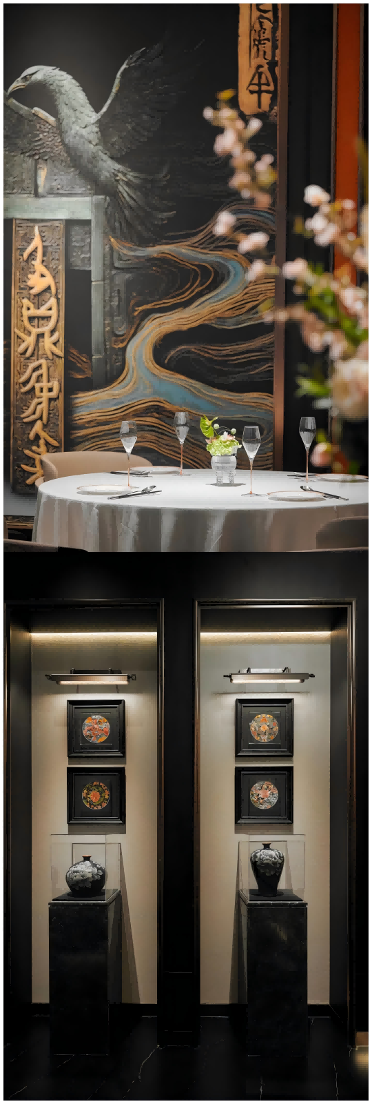 從融入鯉魚文化與商鼎文化的金屬拱形門頭,到潺潺如黃河奔涌的水幕墻;從非遺木雕的廚祖伊尹像,到轉(zhuǎn)角處不經(jīng)意邂逅的豫劇鳳冠與玄鳥(niǎo)紋樣——這不僅僅是餐廳,而是一座可沉浸式漫步的“河南文化體驗(yàn)館”。知名設(shè)計(jì)師以現(xiàn)代筆觸,將五千年中原文明符號(hào)凝練于空間敘事之中。