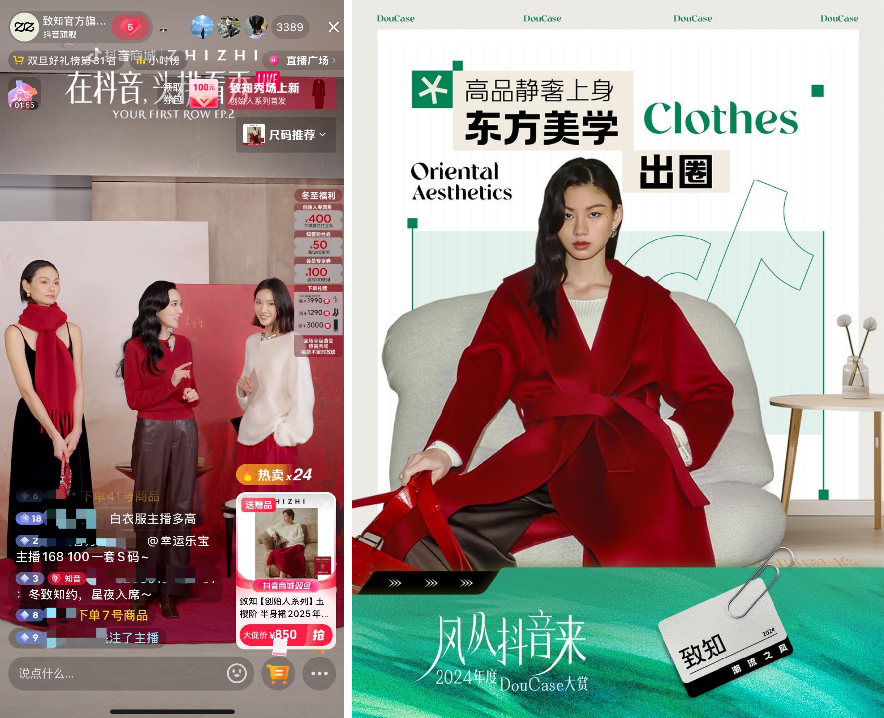 3 整個2024年,已經(jīng)有很多很多品牌和商家在抖音電商上抓住了風,抓住了風里潛藏的商業(yè)機會。 只要你也有【捕風】的意愿和想法,那你同樣可以成為其中的一員。 如果你的優(yōu)勢是內(nèi)容創(chuàng)作能力強,那你就可以嘗試用優(yōu)質(zhì)內(nèi)容為用戶制造高級感和驚喜感。 女裝品牌致知就趁著華夏風正勁,用大量優(yōu)質(zhì)內(nèi)容呈現(xiàn)出品牌獨特的高級審美。 除了短視頻種草,它還把線下秀場搬到了線上的抖音品牌直播間。