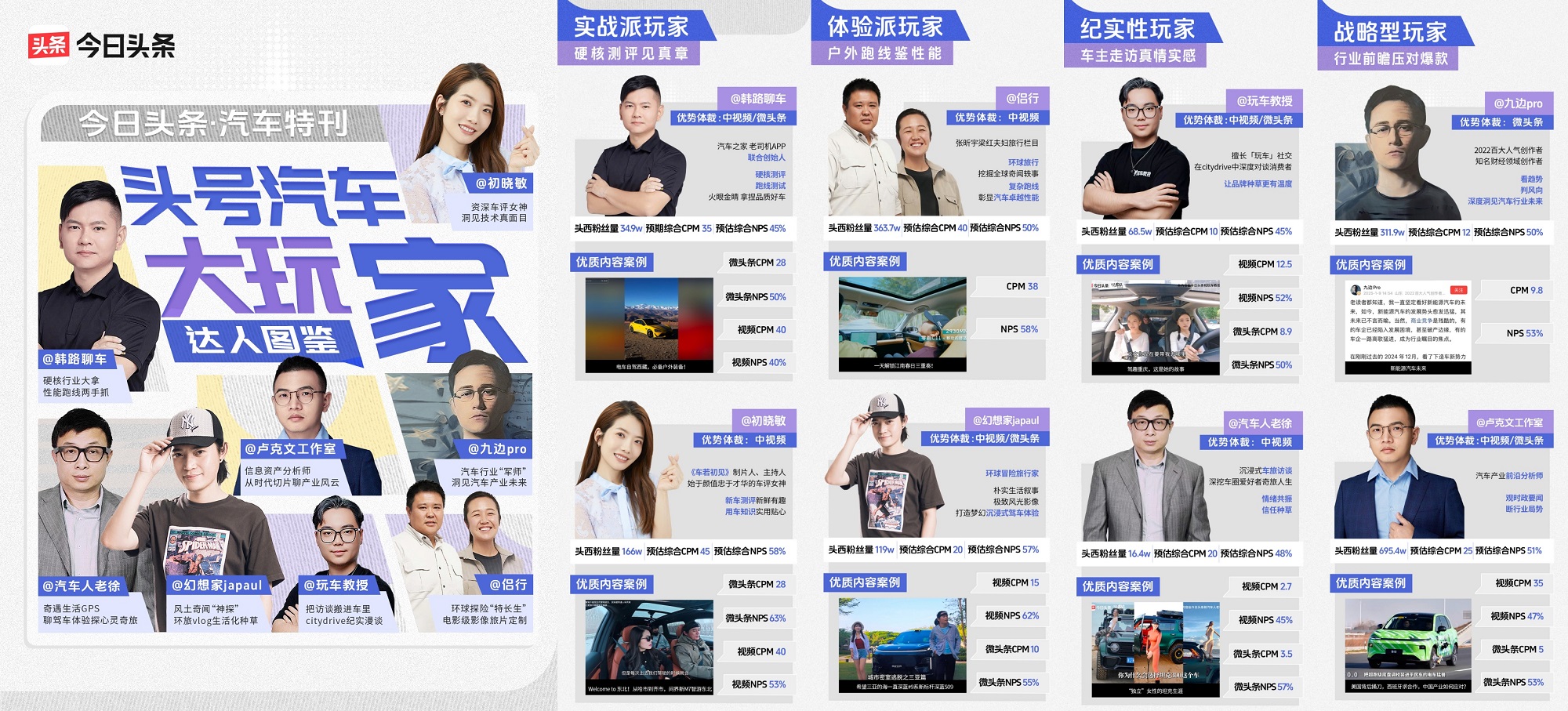在垂直領(lǐng)域,今日頭條還推出「頭號(hào)汽車大玩家」達(dá)人圖鑒,依托汽車行業(yè)KOL與技術(shù)型達(dá)人的專業(yè)背書,結(jié)合自駕游、攝影等場景展示車型實(shí)用性,突破傳統(tǒng)廣告局限。例如:硬核汽車達(dá)人@韓路聊車 結(jié)合自駕游的實(shí)際體驗(yàn),展示車輛在不同路況下的表現(xiàn)。憑借其專業(yè)的視角和技術(shù)背景,韓路幫助觀眾深入了解了汽車品牌各項(xiàng)優(yōu)勢(shì)(視頻CPM 25,NPS 76%),有效提升品牌的可信度和用戶的購買意愿。旅行類達(dá)人@侶行 通過真實(shí)的場景化種草方式,可做到吸引大量關(guān)注的同時(shí),且顯著提升品牌認(rèn)知度和好感度(視頻CPM 40,預(yù)期NPS 50%)。場景化種草潛移默化影響用戶心智,實(shí)現(xiàn)品牌高質(zhì)價(jià)比的營銷觸達(dá)。