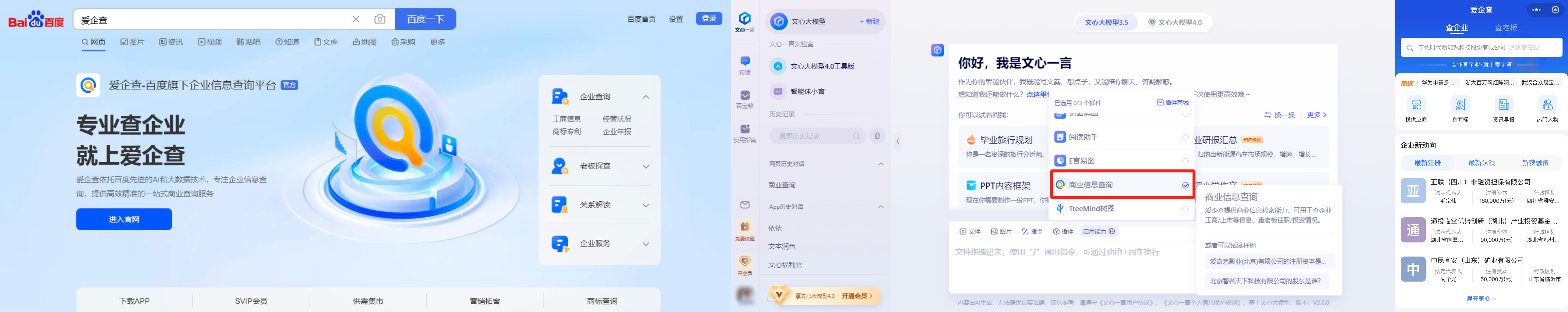 目前,用戶可在愛企查官方網(wǎng)頁、APP及小程序開啟便捷查詢,在此之外,愛企查也在不斷延展服務場景。去年11月,于文心一言PC端上線“商業(yè)查詢插件”,引領商查行業(yè)AI產(chǎn)品服務創(chuàng)新升級。