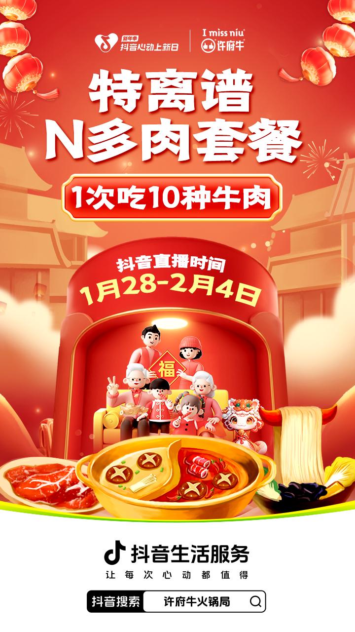 新年之初,牛肉火鍋知名品牌許府牛攜手「抖音心動(dòng)上新日」,共同探索新年聚餐場(chǎng)景新可能,于1月22日至2月4日期間,隆重推出“許府牛新春賀喜,牛氣沖天”主題活動(dòng)?;顒?dòng)期間,品牌為大家特別奉上了特離譜N多肉套餐,抖音直播間僅107.9元即可暢享,且不限份數(shù)可無(wú)限回購(gòu)。春節(jié)不打烊,套餐新年也可用。在新年消費(fèi)高峰期,許府牛開(kāi)啟了官方大場(chǎng)直播、明星口播以及頭部團(tuán)購(gòu)達(dá)人PK直播等花式玩法,力度空前的四人套餐福利疊加驚喜霸王餐福袋設(shè)置,持續(xù)烘托著直播間火熱氛圍,引得網(wǎng)友們瘋狂喊話(huà)主播要求“上鏈接”。許府牛此次通過(guò)套餐品類(lèi)創(chuàng)新、直播玩法創(chuàng)新、內(nèi)容場(chǎng)景創(chuàng)新等多重突破,成功將“新年上新,春節(jié)大促”的理念發(fā)揮到極致,進(jìn)而帶動(dòng)了生意銷(xiāo)量的高爆發(fā)、人群心智的深植入以及品牌形象的強(qiáng)刷新。