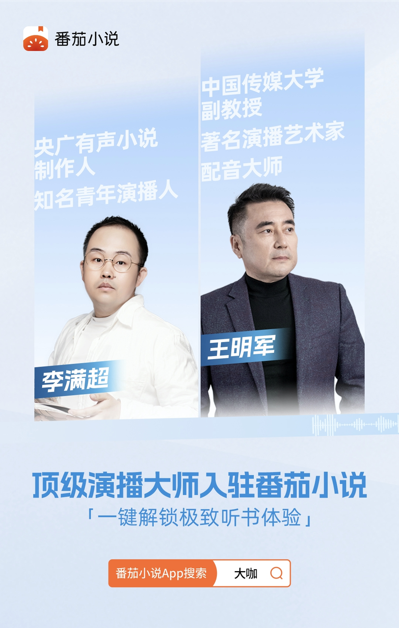 豆包語音模型團(tuán)隊以王明軍、李滿超兩位演播圈大咖的聲音為基礎(chǔ),采用新技術(shù)合成的有聲書,已上線番茄小說,受到用戶的廣泛歡迎。