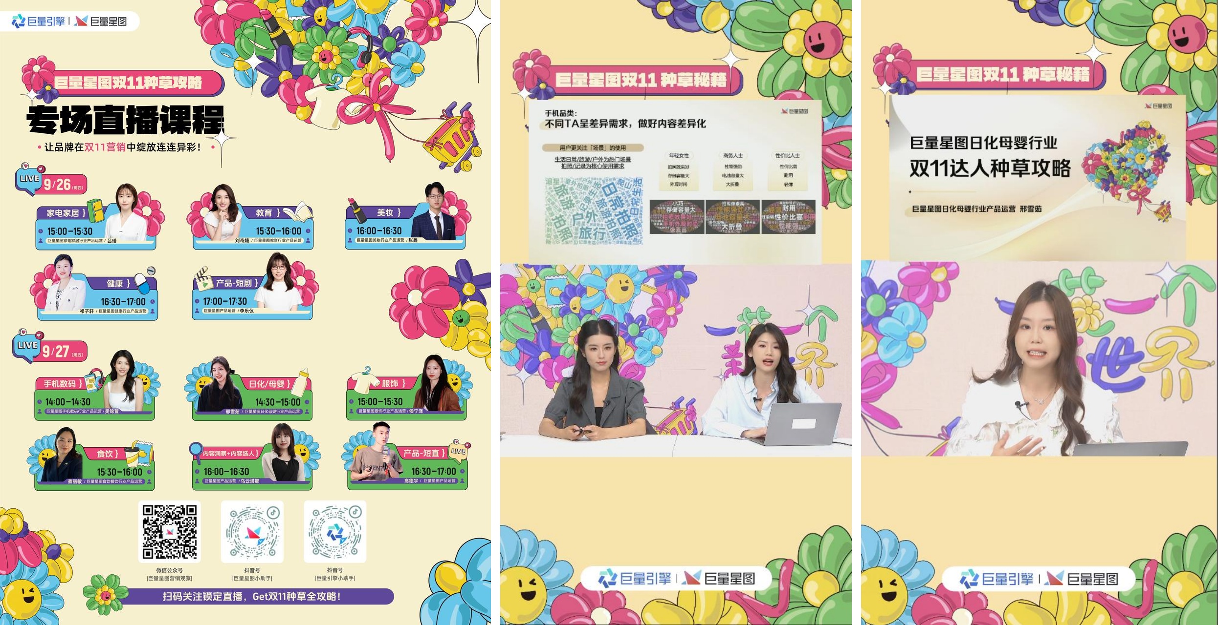為了全方位營銷布局的順利落地,巨量星圖在活動開始前發(fā)布了針對美妝、服飾、日化等9大行業(yè)的雙11趨勢報告,為品牌提供了寶貴的市場洞察,助力品牌把握大促靈感。還同步開啟“好內容走花路”星圖系列直播課程,11位巨量星圖行業(yè)產品運營專家通過分析消費者需求和購買行為推出了針對性的種草策略。兩天時間收獲近42萬觀看量,其中視頻號觀看量達4.22萬,抖音端觀看量達37萬,互動點贊量高達188萬。