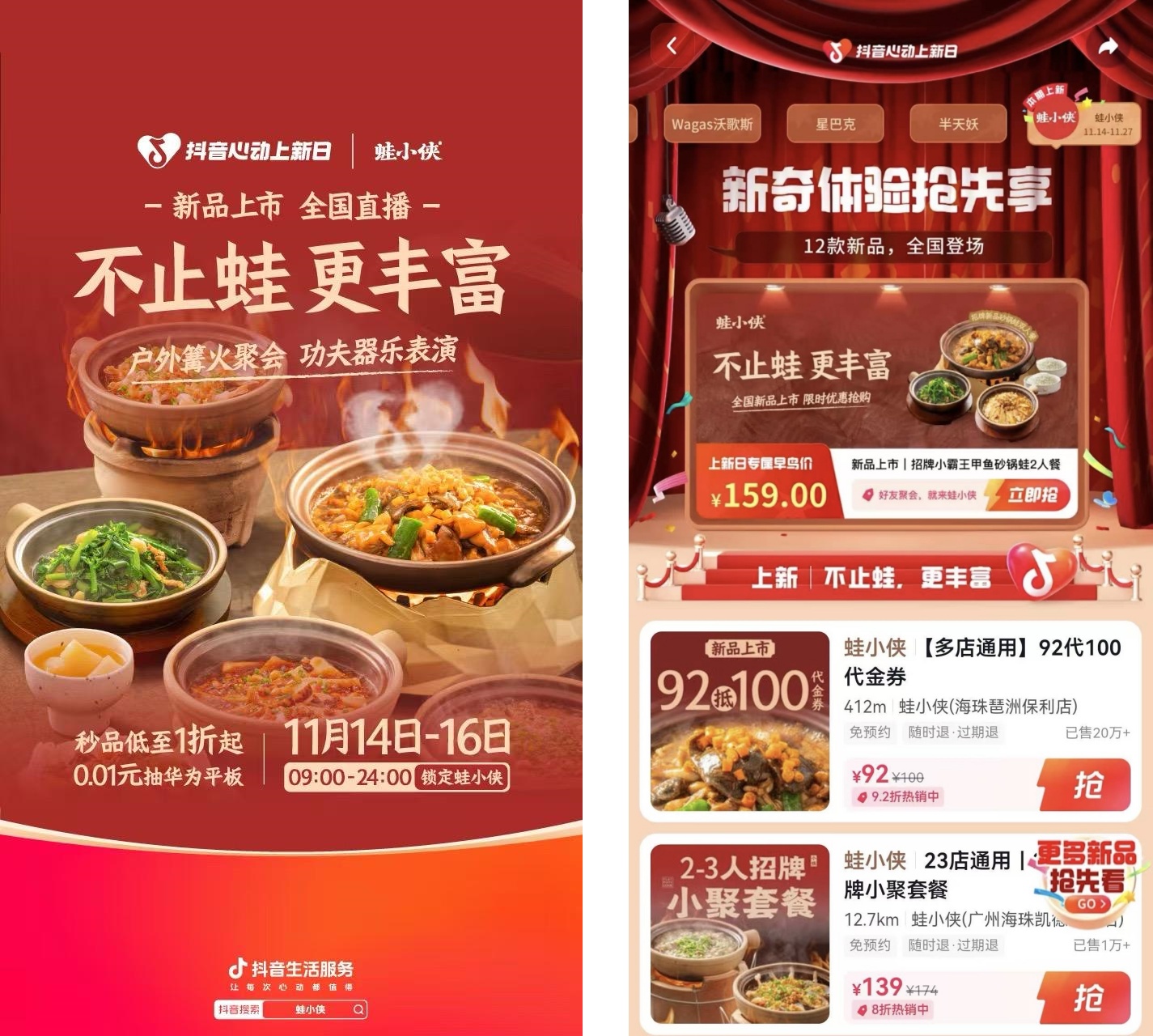 為熱烈慶祝新品的全面上市,蛙小俠攜手「抖音心動(dòng)上新日」特列推出了「不止蛙,更豐富」主題活動(dòng),不僅為大家奉上了沸騰砂鍋系列的心動(dòng)上新品,還通過主理人空降直播間、東方文化演繹、戶外山谷直播等系列互動(dòng)玩法,誠邀廣大吃蛙星人共赴蛙小俠,實(shí)現(xiàn)蛙肉自由,以一鍋熱氣騰騰的蛙鍋治愈整個(gè)冬日。