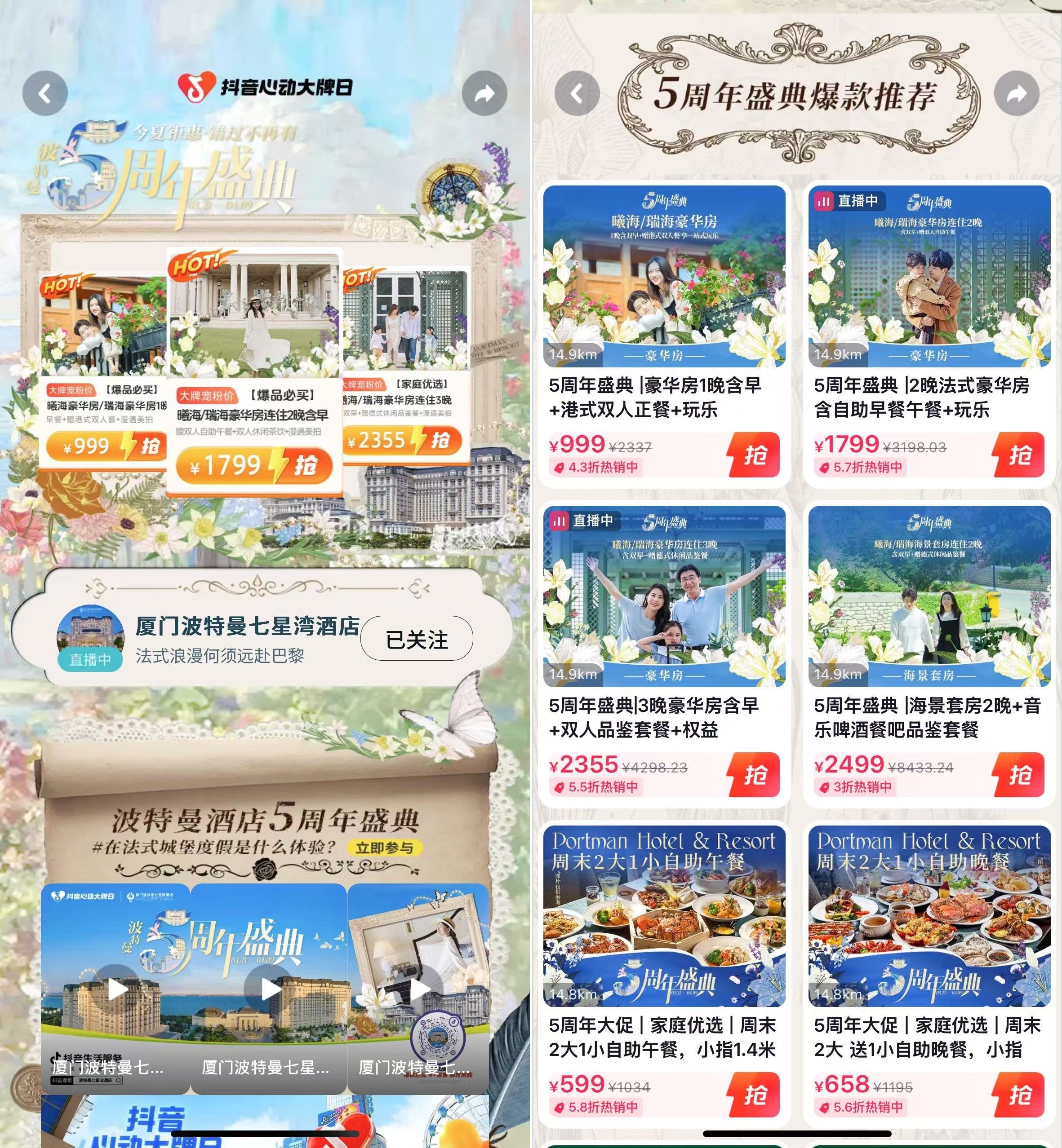 如何不斷拉高粉絲朋友們對5周年盛典的期待感與心動值? 波特曼酒店品牌官方探索出了系列熱門玩法,不斷打響全網(wǎng)聲量。線上端提前打造了#在法式城堡度假是什么體驗、#是廈門不是歐洲、#廈門波特曼酒店5周年盛典等多條熱點話題造勢預(yù)熱,成功引爆消費者社交討論與自發(fā)式傳播;同時配合多系列短視頻內(nèi)容宣傳先行,開屏資源推出“法式心動品牌專區(qū)”等多重玩法,提高用戶看后搜,不斷拓寬活動信息的傳播渠道,讓更多人看到、了解并參與到這場盛大慶典中。 值得一提的是, 波特曼酒店聯(lián)動「抖音心動大牌日」搭建了多場“好看吸睛”直播間,深度聚焦“花草、法式和浪漫”三大視覺元素以營造超絕氛圍感,深化了用戶對異地度假旅游目的地的感知度。本次官方直播間更是突破GMV1074萬,多次登頂酒店直播全國榜一、創(chuàng)福建酒旅單場直播支付新高。 本次品牌新增餐飲直播間,通過探索餐飲直播新玩法,拉高整體GMV及后續(xù)核銷值。直播間不再拘泥美食場景,而是將“法式氛圍感”植入直播,將直播間搬到環(huán)東浪漫線,依海而播,將用戶眼光鎖定在直播間的海景浪漫中。 福利機制也是相當“給力”:每場直播均為大家贈送了高端餐飲套餐等豐厚加碼福袋驚喜隨機掉落,有效提升了用戶在直播間的停留時間和人氣。 為了持續(xù)點燃官方直播間熱度,波特曼酒店還巧妙聯(lián)動站內(nèi)高人氣達人同步開播,通過增加頭部達人參與數(shù)量,既彰顯了品牌影響力,又借助明星達人的粉絲效應(yīng),提高了品牌曝光和粉絲關(guān)注度。 落實到線下層面,波特曼酒店結(jié)合大牌日心動玩法,在酒店大堂、餐廳、客房等區(qū)域設(shè)置展架和互動打卡裝置,吸引賓客眼球,同時在周邊商圈等人流密集區(qū)大屏滾動“種草”用戶,多維度帶動大促破圈傳播的同時, 全方位滲透了“來廈門,就住波特曼”的心智概念。