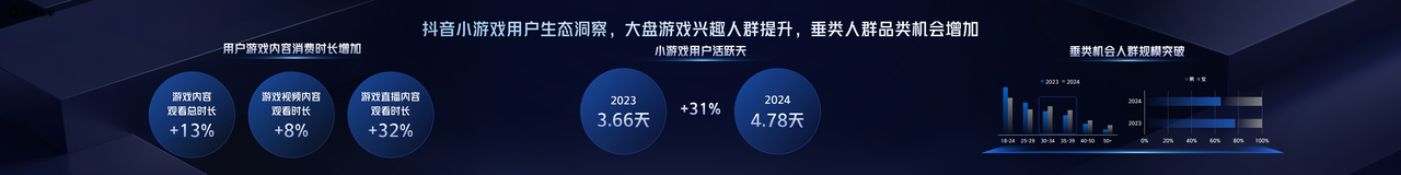 內容生態(tài)層面,游戲攻略、UGC搞怪吸睛、現(xiàn)實題材映射等各類內容多點開花,眾多頭部作者涌現(xiàn),帶動更多游戲廠商收獲自然流量獲客的增長機會。同時,小游戲直播生態(tài)增長迅猛,IAP游戲流水增長105%、小游戲開播UV提升375%、啟動 UV提升200%。與之相對應,2024年抖音小游戲用戶活躍天提升31%,游戲內容觀看總時長同比增長13%、游戲直播觀看時長同比提升32%。