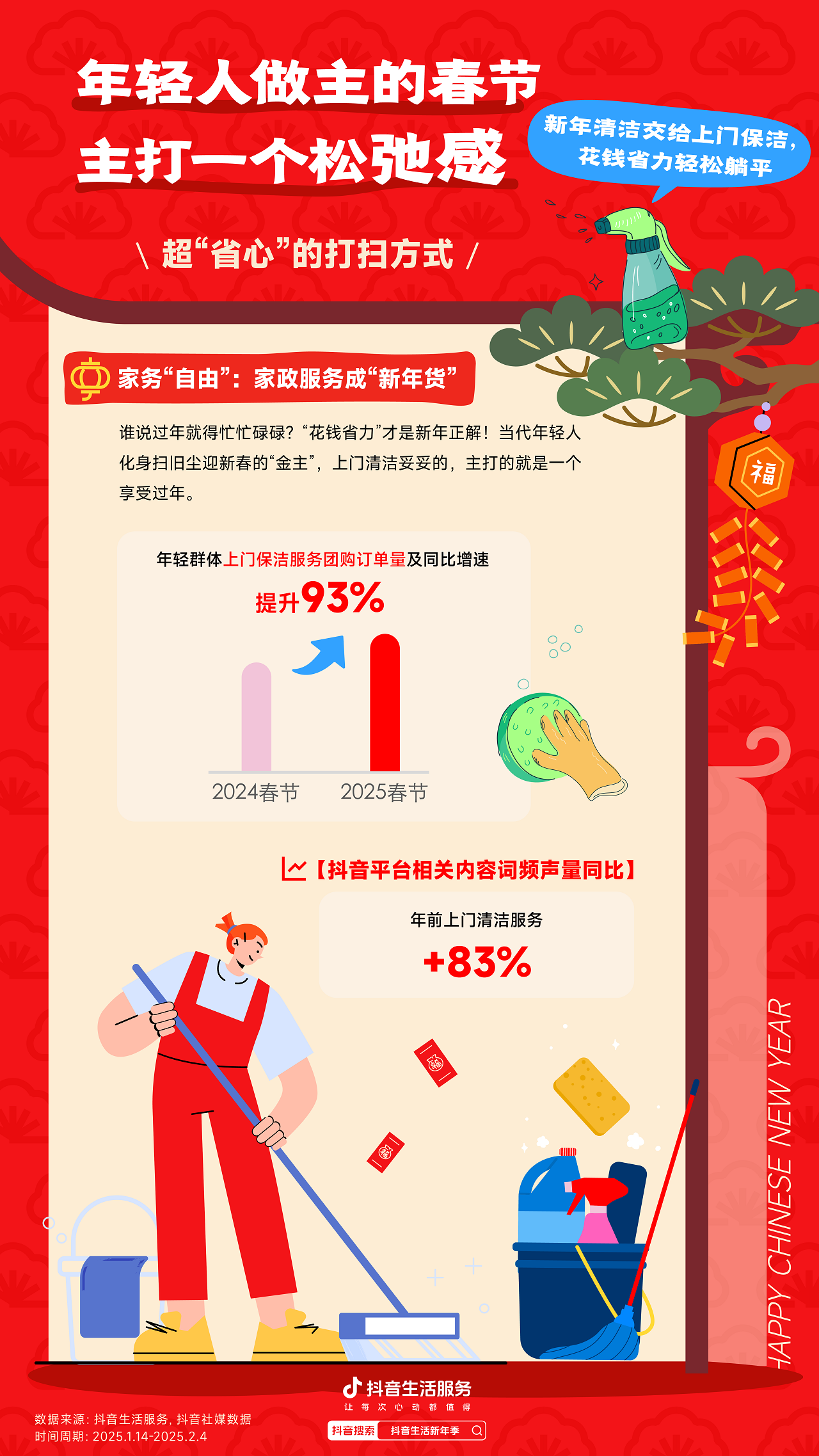 2025年春節(jié)期間,年輕人上門保潔服務(wù)的團(tuán)購(gòu)訂單量同比去年增長(zhǎng)了93%,年前上門清潔服務(wù)的相關(guān)內(nèi)容聲量也同比增長(zhǎng)了83%。