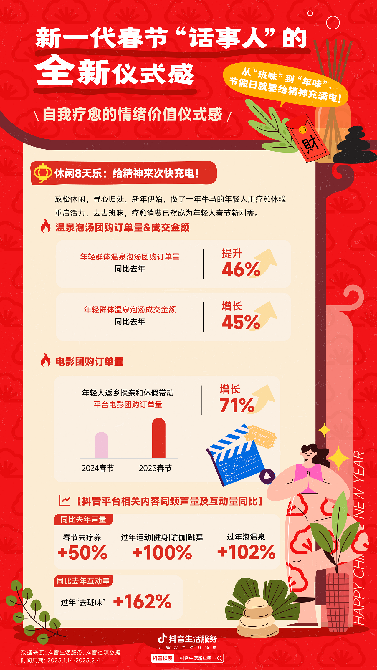 看電影、泡溫泉、做瑜伽、做療養(yǎng)......這些情緒療愈活動(dòng)正在成為年輕人的春節(jié)快樂(lè)必備項(xiàng)目。隨著年輕人返鄉(xiāng)探親和休假,也推動(dòng)了各地情緒消費(fèi)的熱潮。平臺(tái)數(shù)據(jù)顯示,今年春節(jié),年輕人溫泉泡湯的團(tuán)購(gòu)訂單量和成交金額同比增長(zhǎng)了46%和45%,平臺(tái)電影團(tuán)購(gòu)訂單量也同比增長(zhǎng)了71%。