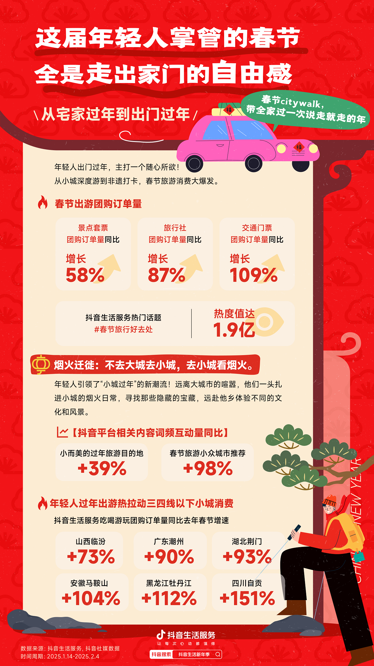 根據(jù)抖音生活服務(wù)數(shù)據(jù),春節(jié)出游團(tuán)購(gòu)訂單量大幅提升,其中景點(diǎn)套票團(tuán)購(gòu)訂單量、探店達(dá)人帶動(dòng)旅行社團(tuán)購(gòu)訂單量、交通門票團(tuán)購(gòu)訂單量分別同比增長(zhǎng)58%、87%、109%。