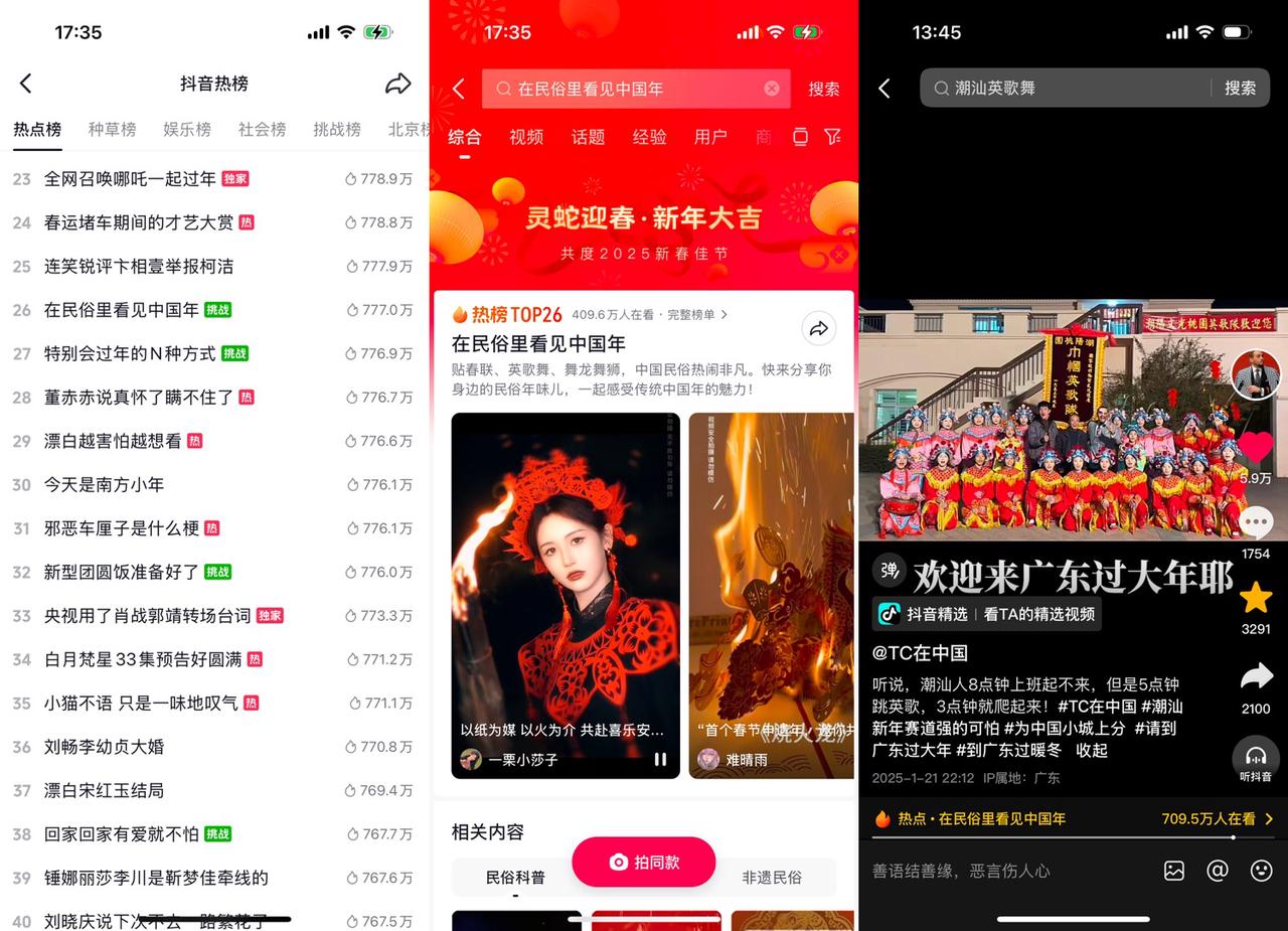 這場大眾與地方民俗的雙向奔赴,吸引了更多頗具影響力的達(dá)人加入,如戶外達(dá)人@自由的皮皮、旅游博主@美媽澤爸自駕游 等,他們了解著年俗、品味著年味、尋找著年趣。跟隨著他們的腳步,大家對(duì)廣府年味的興趣正濃,非遺、年俗等相關(guān)話題熱度飆升,其中,潮汕憑借英歌舞、迎老爺?shù)葮O具新春氛圍感的年俗脫穎而出,潮汕網(wǎng)友紛紛出來認(rèn)領(lǐng)“現(xiàn)在視頻傳到哪兒了,這對(duì)我很重要”。熱點(diǎn)“潮汕新年賽道強(qiáng)的可怕”也隨之沖上全國榜top5、種草榜top1;熱點(diǎn)“外國人體驗(yàn)廣東粵劇”登上同城榜8。