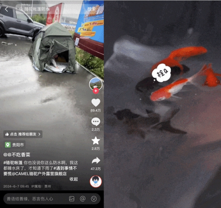 今年 6 月,有抖音用戶曬出了一段「漂流」奇遇:自己在外搭帳篷過夜,突遇大雨漲水,絲毫沒有進(jìn)水的帳篷竟然漂浮在水上了。因為效果太過直觀,相關(guān)話題開始發(fā)酵,突發(fā)熱點 #第一次見這么防水的帳篷 登上種草榜 TOP 8,帳篷的品牌方駱駝火速下場認(rèn)領(lǐng)了這一話題,與用戶熱情互動,同時品牌直播間也及時跟進(jìn)熱點,現(xiàn)場演繹「帳篷養(yǎng)魚」,再現(xiàn)硬核防水功能