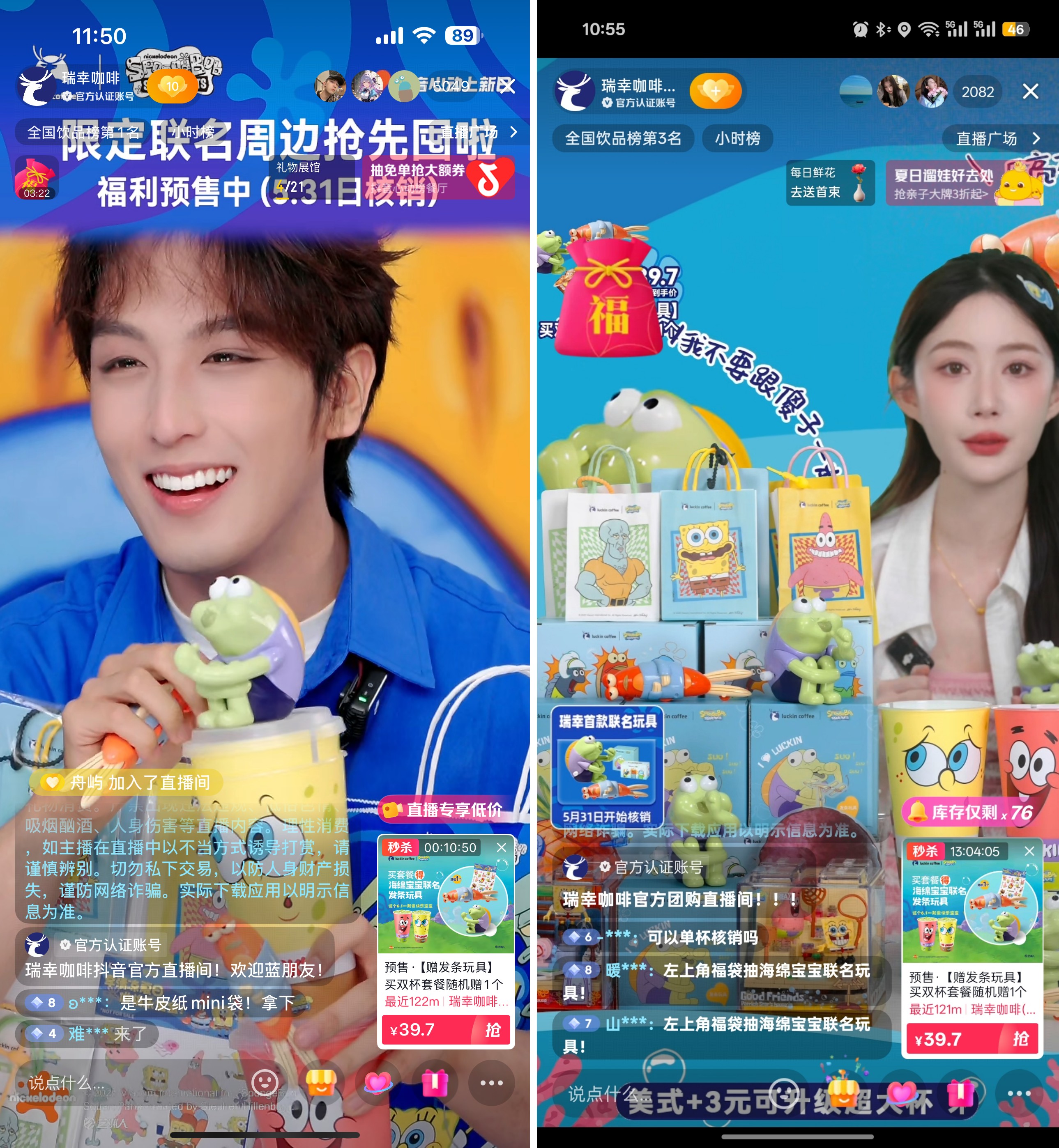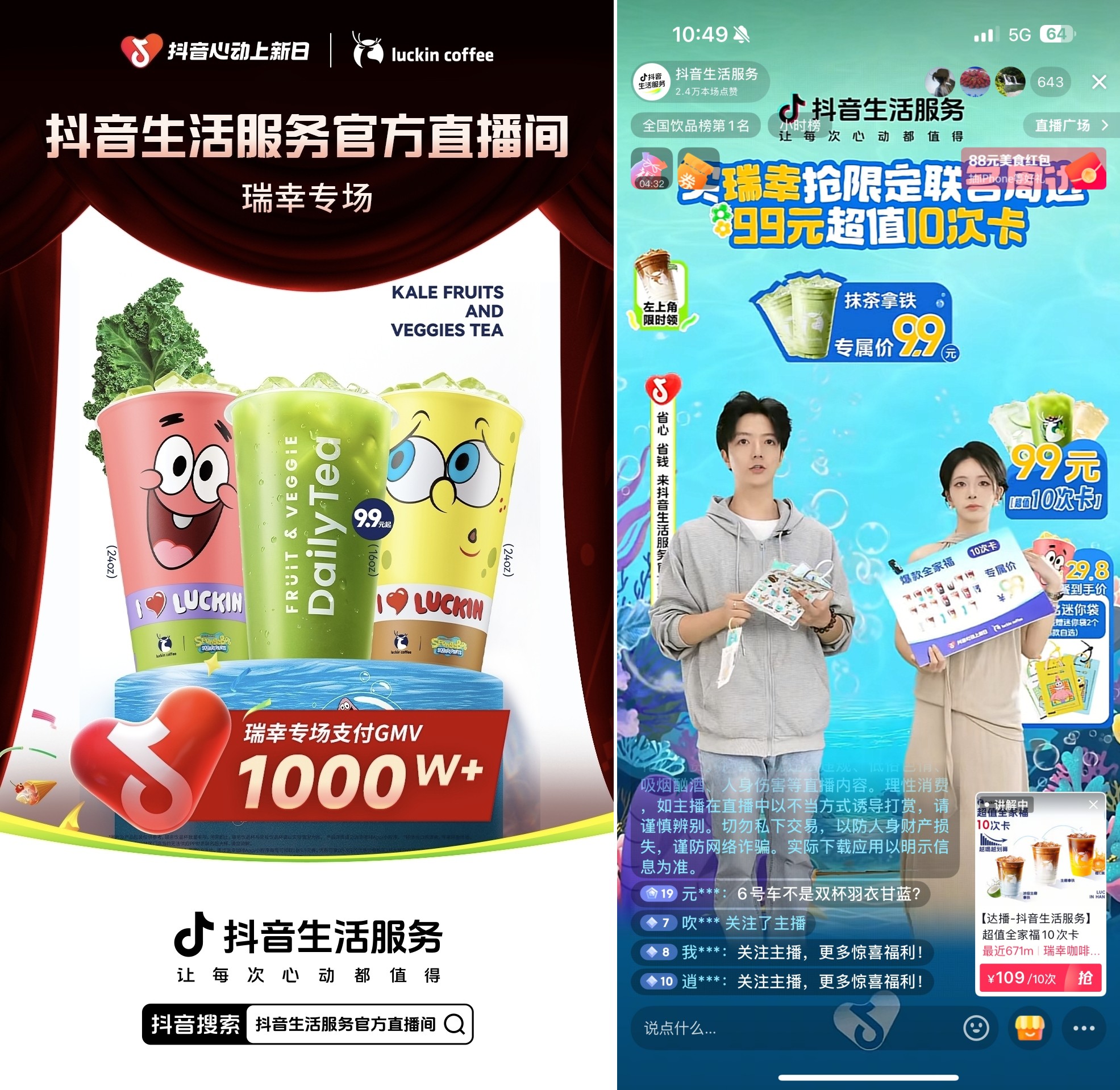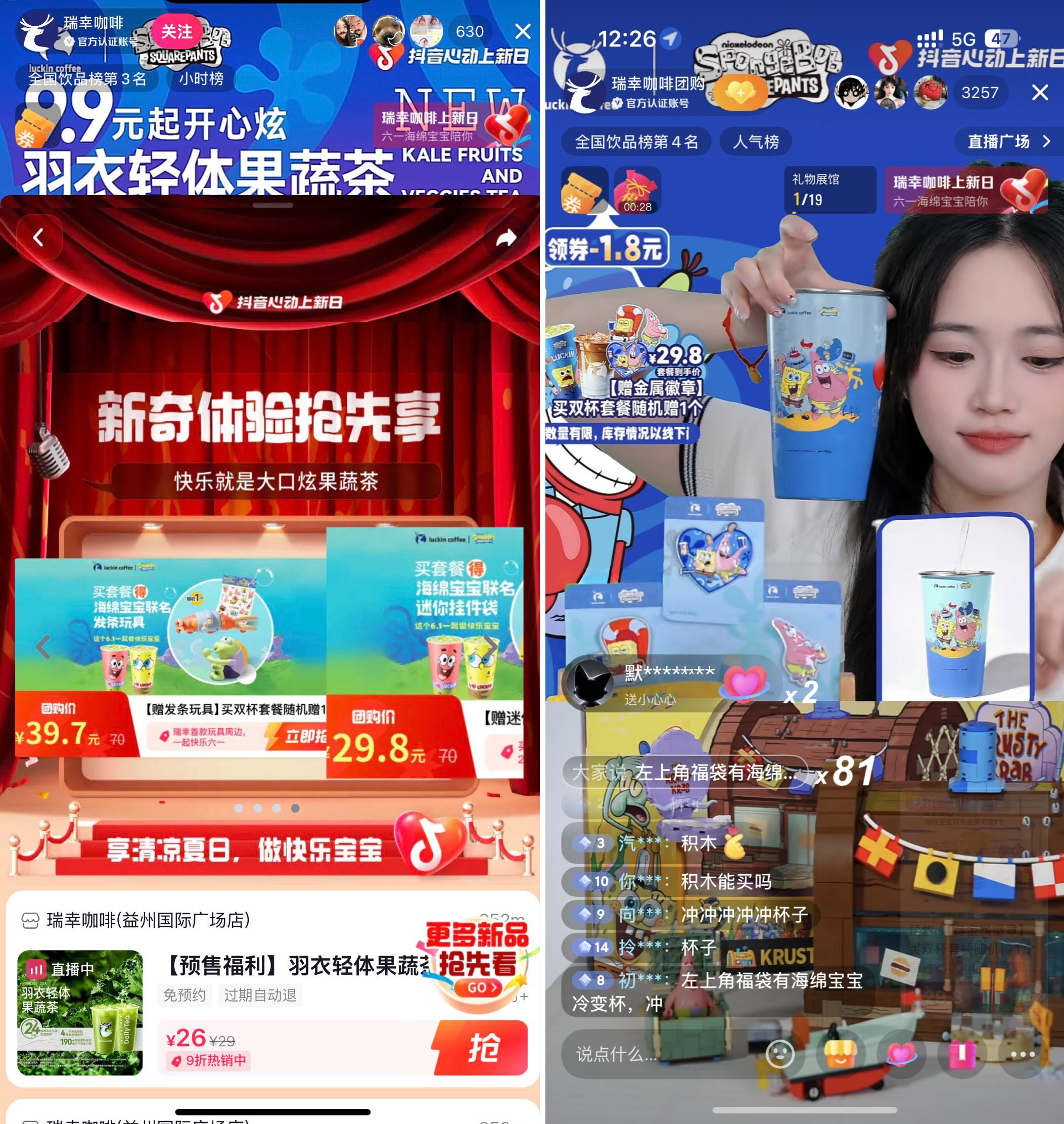 5月30日至6月12日,瑞幸咖啡攜手「抖音心動(dòng)上新日」推出了“瑞幸咖啡x海綿寶寶,聯(lián)名產(chǎn)品羽衣輕體果蔬茶上新”主題活動(dòng),以獨(dú)家首發(fā)“羽衣輕體果蔬茶”為核心契機(jī),通過抖音獨(dú)家直播與全域話題傳播雙線并進(jìn)的策略強(qiáng)勢(shì)出擊。直播間構(gòu)建了沉浸式“劇情IP狂歡”,巧妙結(jié)合六一節(jié)點(diǎn)推出趣味劇場(chǎng)、互動(dòng)PK賽等環(huán)節(jié),并輔以限量聯(lián)名福袋激發(fā)即時(shí)轉(zhuǎn)化;同時(shí),在全域短視頻陣地發(fā)起系列話題傳播,成功打通了從產(chǎn)品曝光到情感共鳴的完整鏈路。