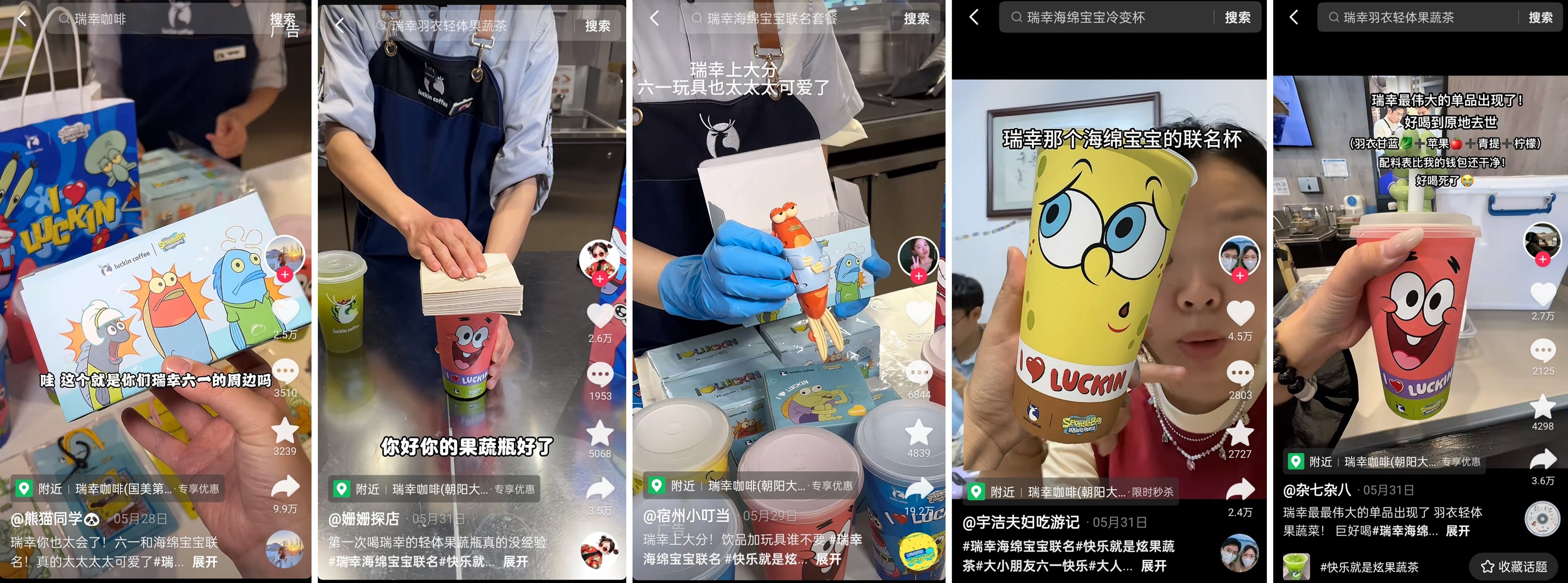 直播之余,品牌在短視頻陣地也同步發(fā)力,發(fā)起了#瑞幸海綿寶寶聯(lián)名 、#快樂就是炫果蔬茶 、#瑞幸果蔬茶解鎖鮮爽夏日 等多條核心話題,不僅精準(zhǔn)傳遞了聯(lián)名信息與新品清爽健康的特性,更在平臺(tái)內(nèi)迅速形成討論熱潮,提升了新品曝光與用戶關(guān)注度。另外,品牌還廣泛攜手平臺(tái)達(dá)人,通過創(chuàng)意短視頻內(nèi)容進(jìn)行新品宣傳和場(chǎng)景種草,有效覆蓋目標(biāo)客群。這套組合拳打法助力品牌實(shí)現(xiàn)了客群拉新與老客回購(gòu)的雙重目標(biāo),讓“瑞幸果蔬茶”成為今夏社交平臺(tái)上的高頻討論詞。