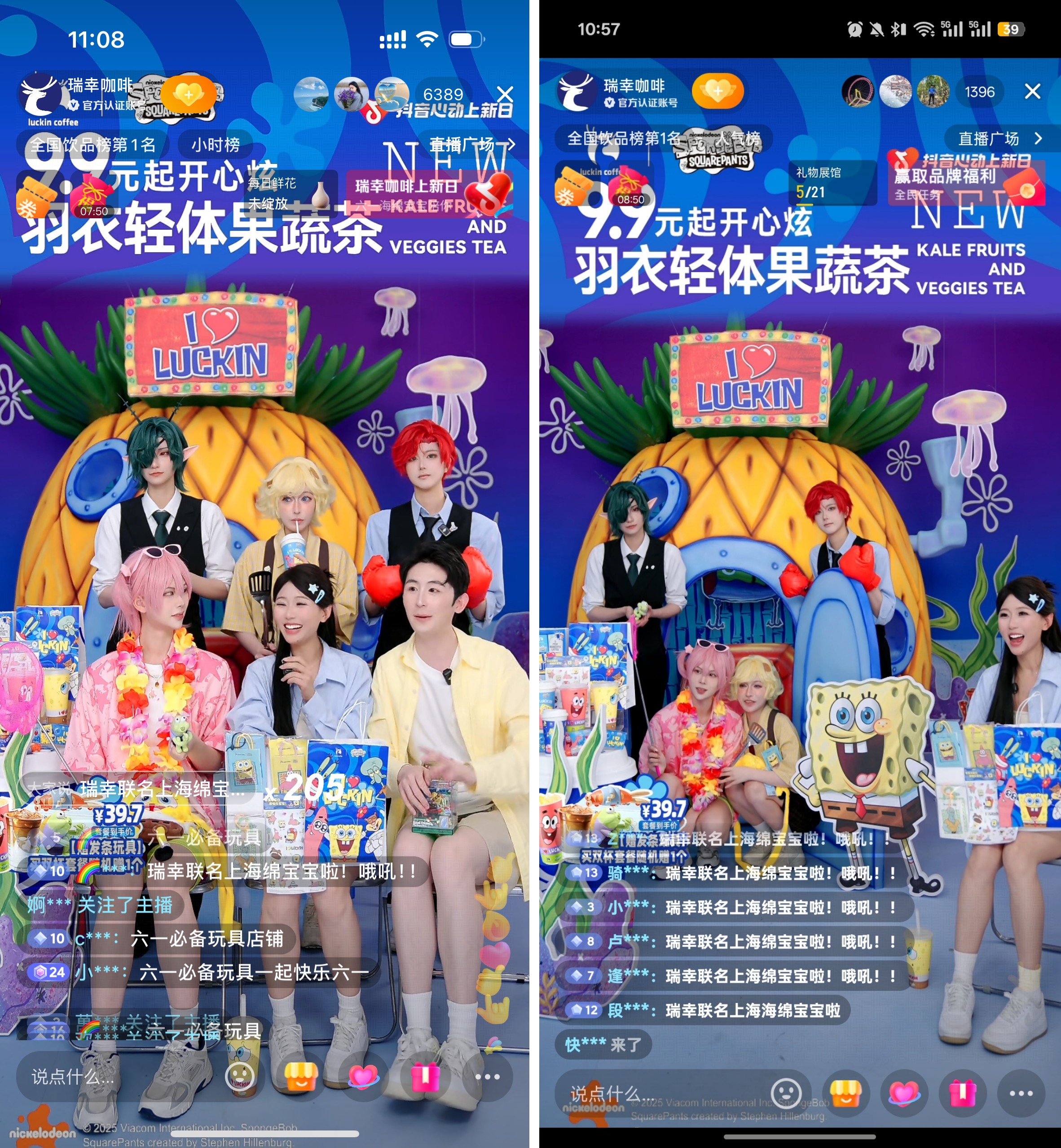 直播間內(nèi),人氣主播、Coser與海綿寶寶IP深度聯(lián)動(dòng),創(chuàng)新打造“分時(shí)段劇情式直播”模式:從上演妙趣橫生的海綿寶寶小劇場(chǎng),到緊張刺激的組隊(duì)PK新品秘方爭(zhēng)奪戰(zhàn),再到六一特別節(jié)目“深海朋友來(lái)踢館”,環(huán)節(jié)設(shè)計(jì)充滿童真與互動(dòng)感。
