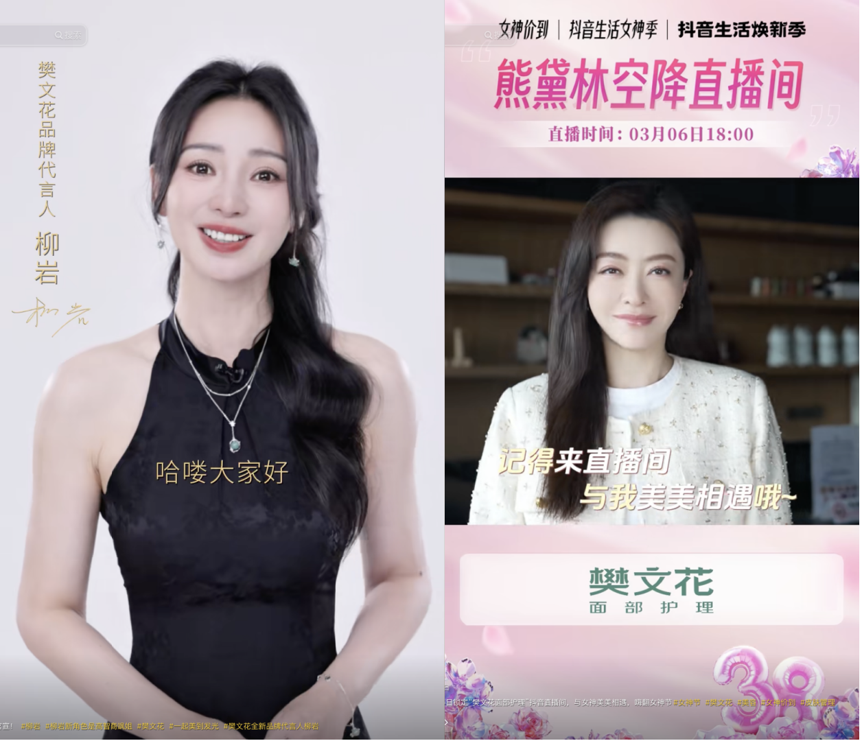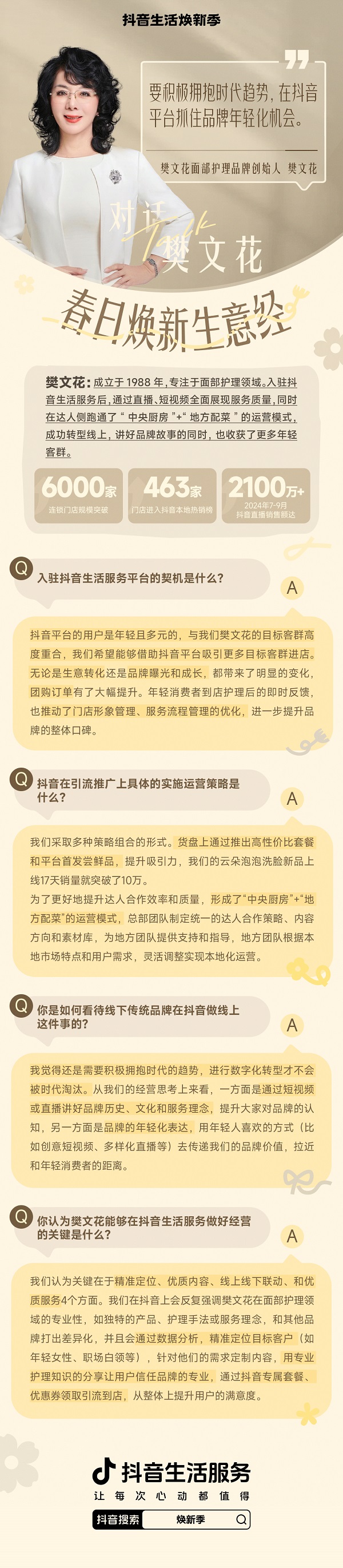 專注線下生意的那些年,年輕女性和樊文花仿佛隔了一層紗:她們更傾向于購買護(hù)膚品、自己動(dòng)手,不習(xí)慣到店享受服務(wù),對(duì)樊文花缺少了解。 而抖音70%以上用戶是樊文花的潛在新客,其中18-35歲的年輕女性占比超85%。 樊文花想借進(jìn)駐抖音的契機(jī),拉近與年輕女性的距離,將她們轉(zhuǎn)化為新增會(huì)員和忠實(shí)粉絲。樊文花首先用興趣撬動(dòng)年輕女性的注意力。明星和護(hù)膚兩大話題討論熱度長(zhǎng)期居高,樊文花順勢(shì)借力,在三八婦女節(jié)、母親節(jié)等女性向節(jié)日節(jié)點(diǎn),聯(lián)動(dòng)多位明星藝人,分享護(hù)膚經(jīng)驗(yàn),有效破圈,拉動(dòng)年輕女性關(guān)注, 助力品牌多次登上全國(guó)麗人榜榜首。今年「抖音生活煥新季」,創(chuàng)始人樊文花更攜手熊黛林現(xiàn)身直播間,同年輕女性走心分享,最高同時(shí)在線近3萬人, 收獲超2000萬全網(wǎng)總曝光。