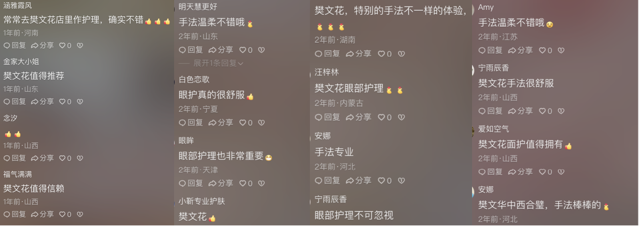 2022年4月,樊文花面部護(hù)理進(jìn)駐抖音生活服務(wù),開通官方抖音號(hào),更新膚質(zhì)類型分析、提拉緊致手法等短視頻,嘗試上架清潔補(bǔ)水和特色抗皺/修護(hù)/嫩膚/清顏團(tuán)購,吸引網(wǎng)友主動(dòng)“匯報(bào)”自己的面部狀態(tài),詢問屬于哪種膚質(zhì)。哪怕沒有線下路過樊文花門店,但越來越多對(duì)美容保養(yǎng)感興趣的用戶開始記住了樊文花面部護(hù)理。