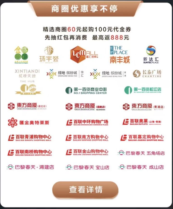 24小時(shí)營業(yè)的便利店是一座城市的溫情燈塔,特別是在午夜后,臨街的店鋪大多已經(jīng)打烊,只有各家便利店,仍燈火通明地在深夜中堅(jiān)守。上海的便利店是一道獨(dú)特的城市“風(fēng)景線”,根據(jù)相關(guān)報(bào)告,其便利店數(shù)量穩(wěn)居全國第一。此次“魔都萬家商戶5折起”活動(dòng)中,上海超1600家便利店購物5折起,客戶在7-11、羅森、全家等便利店買單時(shí),更可享“一招過”隨機(jī)立減活動(dòng)。 商圈作為城市的地標(biāo)性綜合體,既是城市發(fā)展的烙印,也是市民“一站式”吃喝玩樂購的重要場(chǎng)所。此次“魔都萬家商戶5折起”活動(dòng),招行信用卡客戶可在不同商圈分別參與60元起購100元指定商圈消費(fèi)券,或抽招財(cái)紅包,最高可享888元返現(xiàn)。參與的商圈都是上海極具代表性的,涵蓋金橋國際、虹橋天地、虹橋南豐城、第一八佰伴等近30家人氣商場(chǎng)。