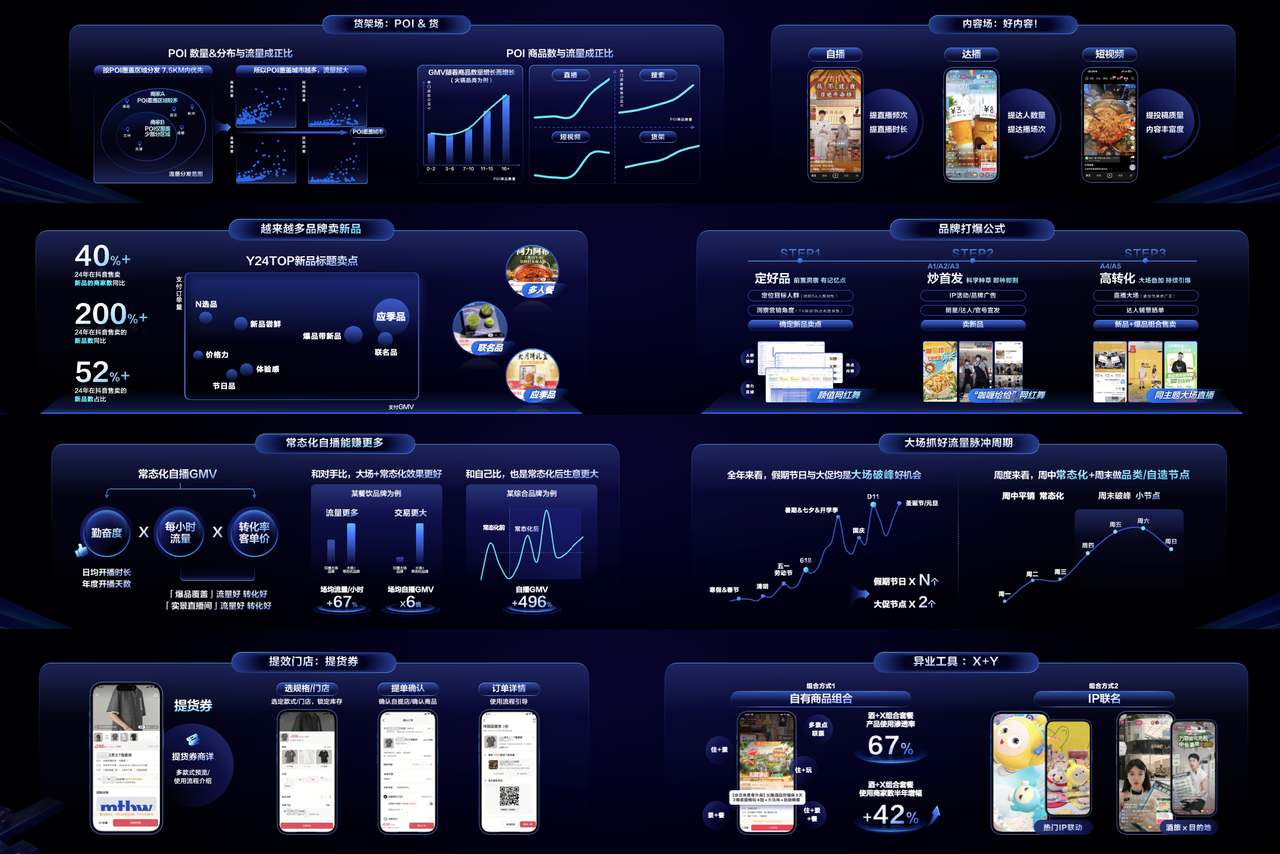 貨盤玩法上,品牌打爆也歸納為「三步走」的公式方法論:通過前置洞察,做好「定好品」 、「炒首發(fā)」實現(xiàn)科學(xué)種草、大場疊加,持續(xù)引爆來促進(jìn)「高轉(zhuǎn)化」。在場景運營上,抓好流量脈沖周期至關(guān)重要。全年來看,假期節(jié)日與大促均是大場破峰好機(jī)會,周度來看,周中常態(tài)化+周末做品類/自造節(jié)點也將帶來破峰小高潮。平臺能力持續(xù)升級,帶來了門店提效「提貨券」和異業(yè)工具「X+Y」的助力,為消費者和品牌商家,進(jìn)行消費體驗及商家組合產(chǎn)品滲透的提升。