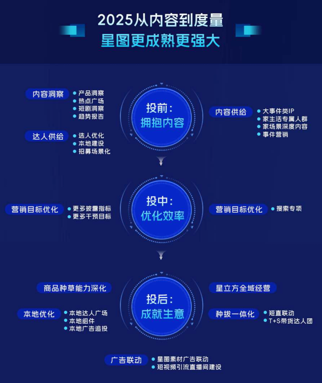 除內(nèi)容池的持續(xù)精耕細(xì)作及不斷拓寬外,內(nèi)容投放效率的提升及價值度量,也在巨量星圖上得到了持續(xù)加強(qiáng)和驗證。打造了「擁抱內(nèi)容」、「優(yōu)化效率」、「成就生意」的投前、投中、投后「三部曲」。投前,基于平臺的內(nèi)容生態(tài)及達(dá)人儲備,通過內(nèi)容洞察、達(dá)人供給、內(nèi)容供給打造了從內(nèi)容趨勢到內(nèi)容合作及生產(chǎn)的堅實內(nèi)容基礎(chǔ);投中,通過營銷目標(biāo)優(yōu)化不斷修正投放節(jié)奏及指標(biāo),實現(xiàn)效率的提升。投后,商品種草能力深化、本地優(yōu)化、種收一體化、廣告聯(lián)動等系列組合動作的加持下,實現(xiàn)生意的高效轉(zhuǎn)化。