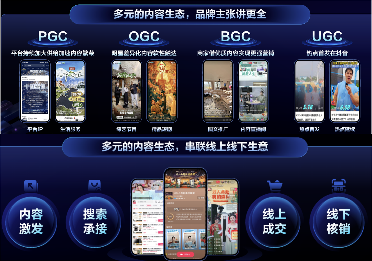 其中,內(nèi)容生態(tài)在營銷場景中實現(xiàn)了激發(fā)消費需求、串聯(lián)線上線下生意、演繹品牌主張、詮釋產(chǎn)品服務(wù)體驗的價值。PGC、UGC、OGC、BGC等多元內(nèi)容實現(xiàn)了內(nèi)容軟性觸達(dá)、優(yōu)質(zhì)內(nèi)容的強(qiáng)力營銷、熱點內(nèi)容的聲量爆破等價值,從營銷鏈路上看,打造了「內(nèi)容激發(fā)→搜索承接→線上成交/線下核銷」的全域閉環(huán)鏈路。