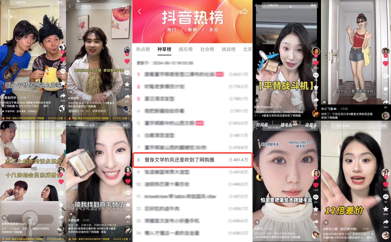 截止6月17日話題#替身文學(xué)的風(fēng)還是吹到了網(wǎng)購圈,播放量1070.3w,8位達(dá)人視頻持續(xù)發(fā)酵,助推話題最高熱度值達(dá)461.4萬,最高登種草榜TOP8,累計在榜時長近48小時,最高在看達(dá)487.2w,并成功吸引自來水參與活動。話題頁中有少量自來水帶“替身文學(xué)”話題或文案發(fā)布視頻,主動引領(lǐng)買平替熱潮發(fā)酵。