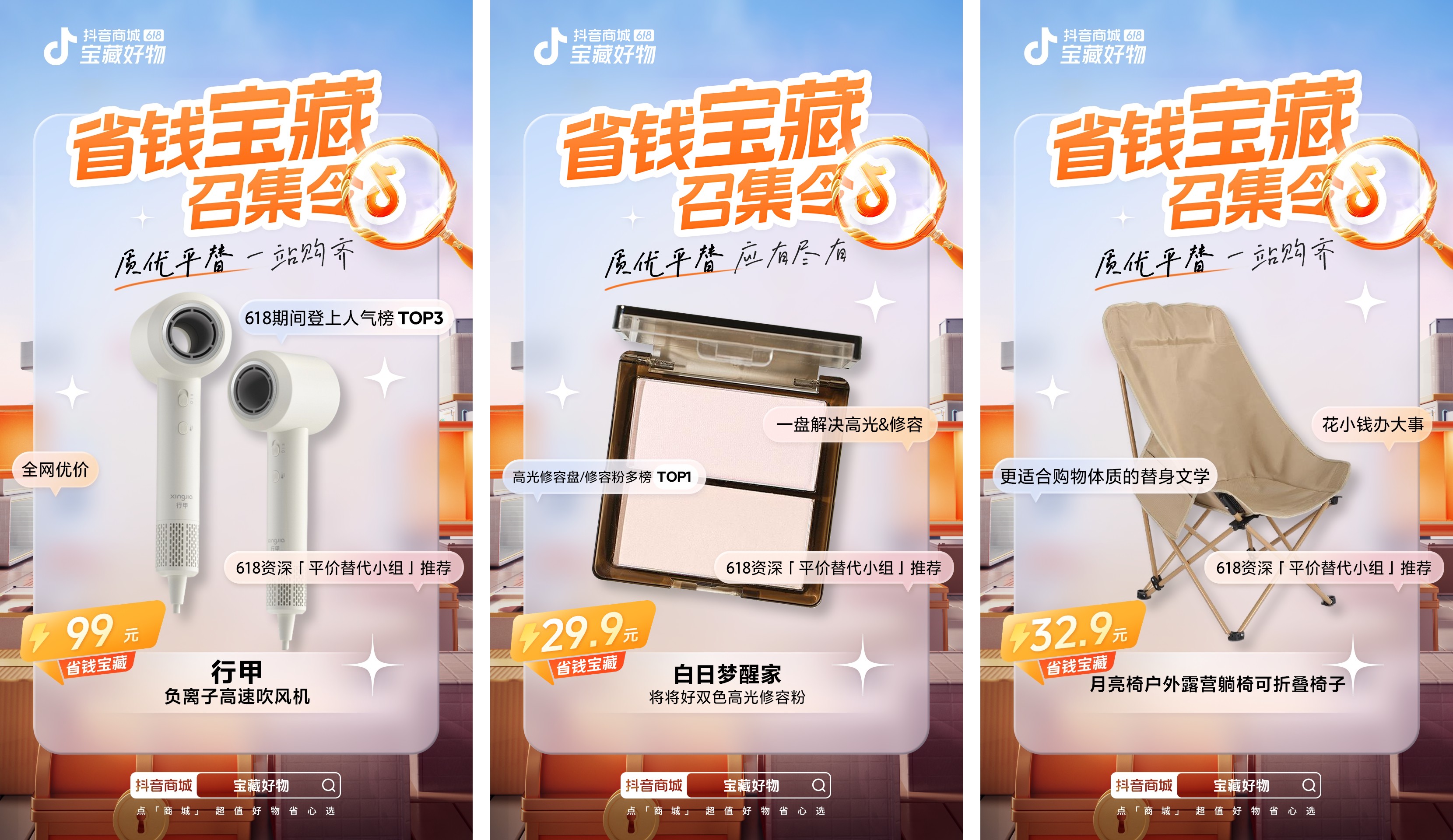 「抖音商城寶藏好物」在今年618發(fā)起的活動,從優(yōu)質(zhì)平替、當(dāng)紅熱銷、新意好品三個維度在全行業(yè)引領(lǐng)商家。