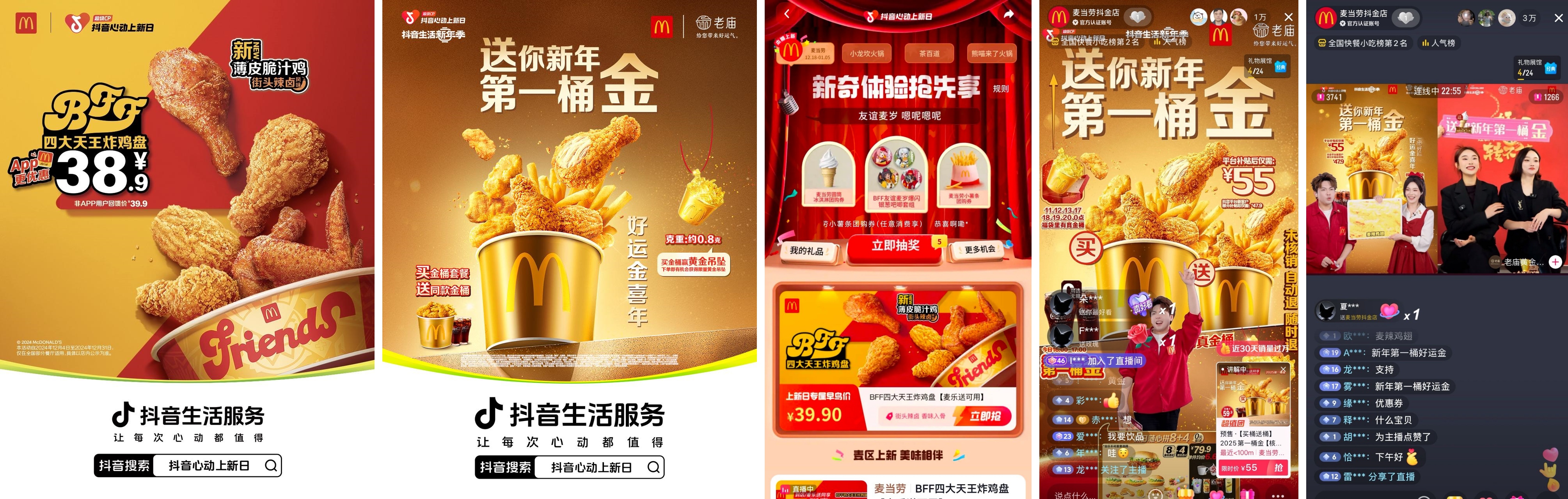 麥當勞緊握新年旺季消費需求,于12月6日至1月5日攜手老廟黃金強力渲染過節(jié)氣氛,依托雙品牌直播連麥、“買桶送桶”套餐福利、平臺團購核銷抽取“真金桶”等熱門玩法,不僅輸出了“跨年不缺金”的新年儀式感,還引爆了一波“吃桶購金”的消費熱潮。