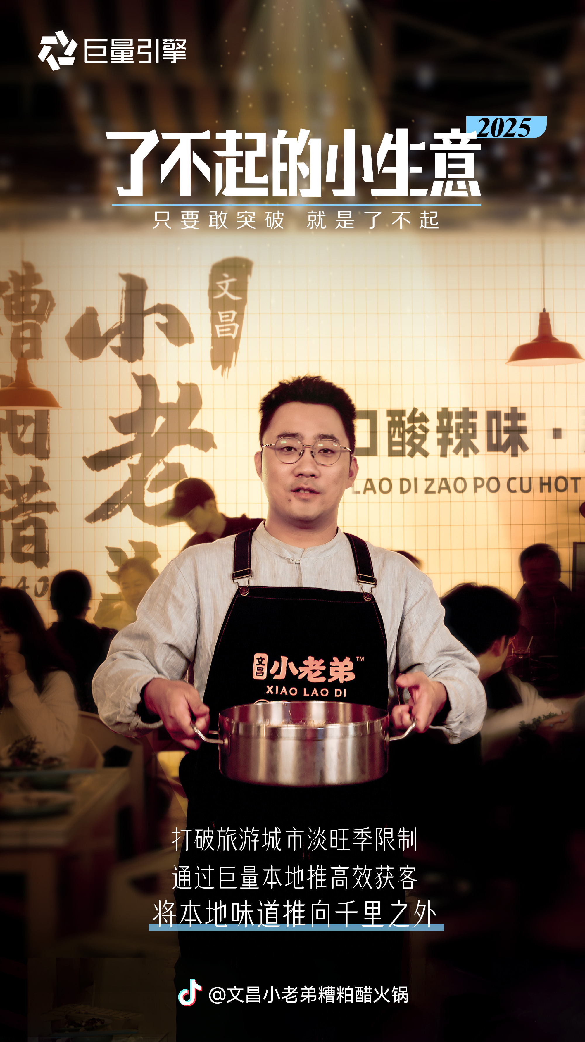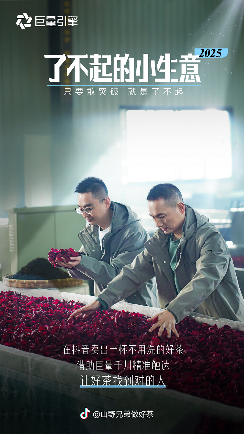 小商家,從來都不是小角色過去一年,抖音上的百萬中小商家不僅完成了從0到1的跨越 在巨量引擎的支持下 每一個看似「小」的生意,都實(shí)現(xiàn)了「大」的突破 據(jù)統(tǒng)計(jì),2024年 電商成長型商家GMV年增長率為平臺大盤的1.1倍本地成長型商家GMV年增長率為平臺大盤的1.4倍中小商家們用實(shí)際行動證明,在抖音做生意: 只要敢突破,就是了不起年終之際,巨量引擎「了不起的小生意2025」年度主題片正式發(fā)布 山和野好茶不怕山高總能找到「對」飲人 普通的茶洗洗也能喝,為什么還要費(fèi)心做一款不用洗的茶呢? 山和野兄弟花費(fèi)7年時間,以雙非遺工藝加持,在對產(chǎn)品極致的追求下 終于在抖音賣出一款不用洗、真花香的好茶 借助巨量千川直播全域推廣精準(zhǔn)找到核心用戶 并通過持續(xù)的投入實(shí)現(xiàn)單場直播GMV翻三倍 不僅在高度同質(zhì)化的茶賽道突出重圍 還盤活了當(dāng)?shù)夭璁a(chǎn)業(yè),帶領(lǐng)村民脫貧致富 文昌小老弟糟粕醋火鍋打破旅游城市淡旺季限制讓本地生意飄香「千里之外」誰說旅游城市的生意就一定有淡旺季? 文昌小老弟的夢想,就是想讓更多國人品嘗到文昌地道糟粕醋的味道 創(chuàng)業(yè)三起三落后,在抖音開店成為轉(zhuǎn)機(jī) 通過巨量星圖達(dá)人探店,讓“糟粕醋”成功走入全國食客的心 在淡季堅(jiān)持用巨量本地推投廣,喚醒食客的味蕾 行業(yè)傳統(tǒng)觀念里的淡季,反而成為小老弟拓展食客人群的好機(jī)會 外地用戶占比高達(dá)70%,成功讓糟粕醋的香味飄向更遠(yuǎn)的未來