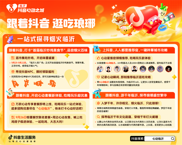 抖音生活服務(wù)將視線聚焦這座低調(diào)內(nèi)秀城市的美食文化精華,將在9月20日-10月9日重磅上線「心動臨沂」活動,耦合臨沂商務(wù)局主辦的“臨沂炒雞美食節(jié)”,在活動周期內(nèi)向用戶安利這座寶藏城市。線下舉辦炒雞大賽、美食市集,打造古風(fēng)主題門店呈現(xiàn)感官盛宴;線上開展短視頻大賽,并聯(lián)動高甜夫妻張倫碩&鐘麗緹、有顏有梗的唱作人張遠、治愈系歌手顏人中、人氣偶像組合ONER(岳岳&靈超&木子洋)以及知名美食博主安秋金,一眾明星/超頭達人化身心動臨沂星推官,與抖音人氣古風(fēng)Coser“變裝”心動臨沂古風(fēng)推薦官一起助陣打call,與你共賞臨沂之味。心動之旅即刻出發(fā),快來一起看看吧!