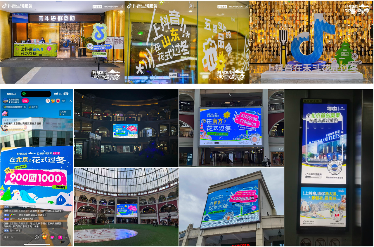 抖音生活服務(wù)在北京、青島、濟(jì)南、哈爾濱、沈陽(yáng)、長(zhǎng)春、南京、常州等城市各大商場(chǎng)樓梯間,六大核心城市中高端樓宇社區(qū)進(jìn)行線下頭客聯(lián)名海報(bào)、188福利券包海報(bào)LED大屏鋪排,在本地消費(fèi)圈層高密度傳播,在活動(dòng)觸達(dá)本地用戶的同時(shí),用冬季賞冰雪、泡溫泉氛圍激發(fā)用戶消費(fèi)情緒,進(jìn)一步擴(kuò)大品牌聲量。