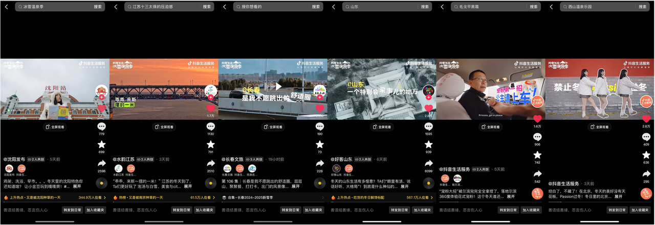 此外,「抖音生活冰雪溫泉季」還聯(lián)動(dòng)沈陽(yáng)、南京、哈爾濱、長(zhǎng)春、北京、濟(jì)南六大城市文旅部打造冬日城市創(chuàng)意主題TVC,通過(guò)官方第一視角輸出一站式過(guò)冬攻略,城市冬日吃喝玩樂(lè)氛圍拉滿的同時(shí),迅速占領(lǐng)了年輕消費(fèi)客群的心智,掀起冰雪旅游熱潮。