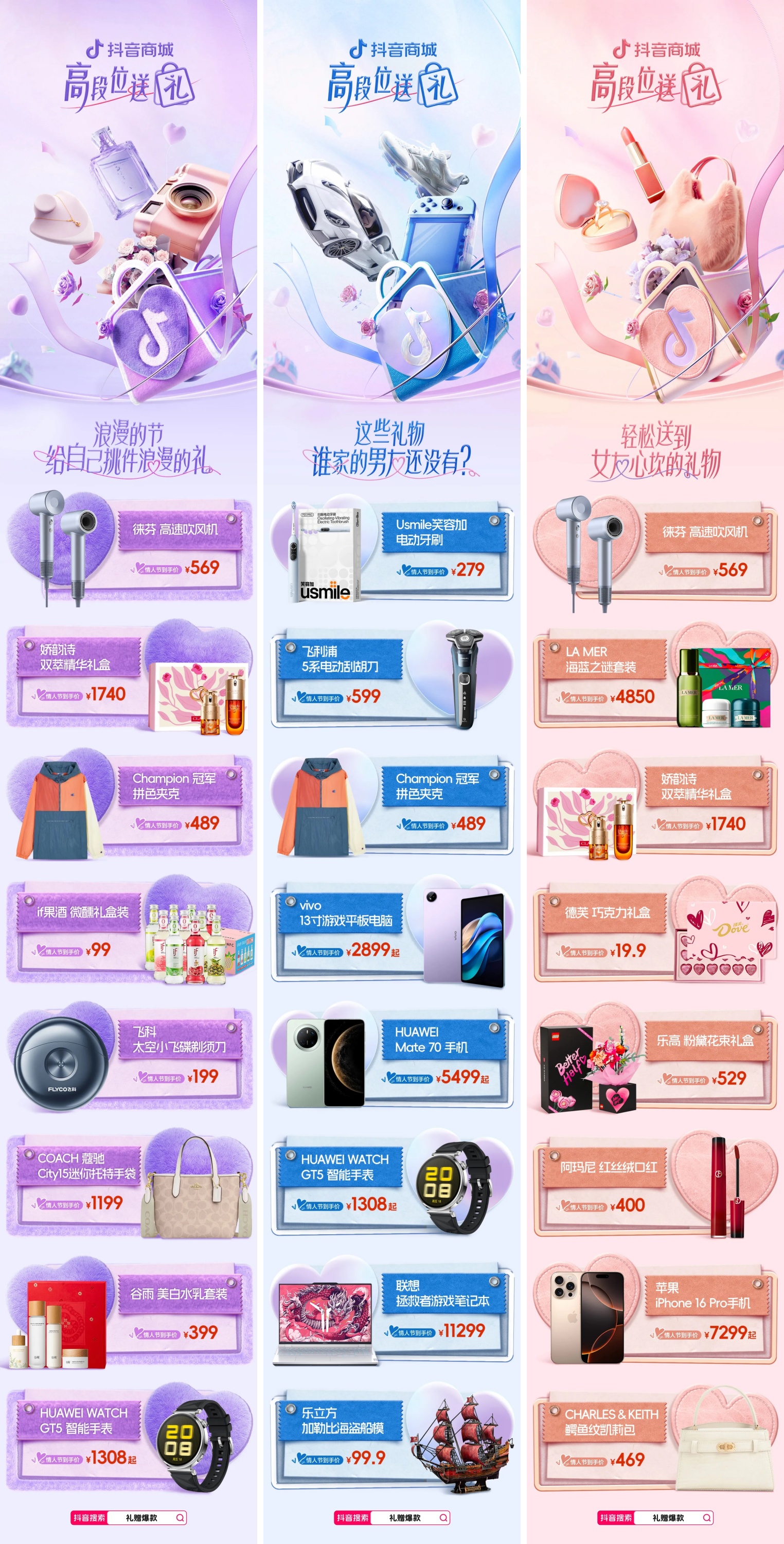 每逢情人節(jié),挑選心意滿滿的浪漫禮物,是節(jié)日儀式感不可或缺的一部分。為貼合用戶多元禮贈需求,抖音商城圍繞“高段位送禮”的核心概念,面向“悅己送自己”、“浪漫送伴侶”等群體,策劃一系列「送禮清單」,不僅為用戶提供了一站式的便捷選禮物方案,讓挑選禮物的過程變得更加愉悅。通過這份清單,用戶能夠輕松找到既能表達(dá)心意,又能讓對方感受到愛意的貼心禮物。對于商家來說,該清單通過精準(zhǔn)定位目標(biāo)消費(fèi)群體,有效吸引更多潛在用戶關(guān)注,為商家?guī)砹烁咝У牧髁哭D(zhuǎn)化機(jī)會。