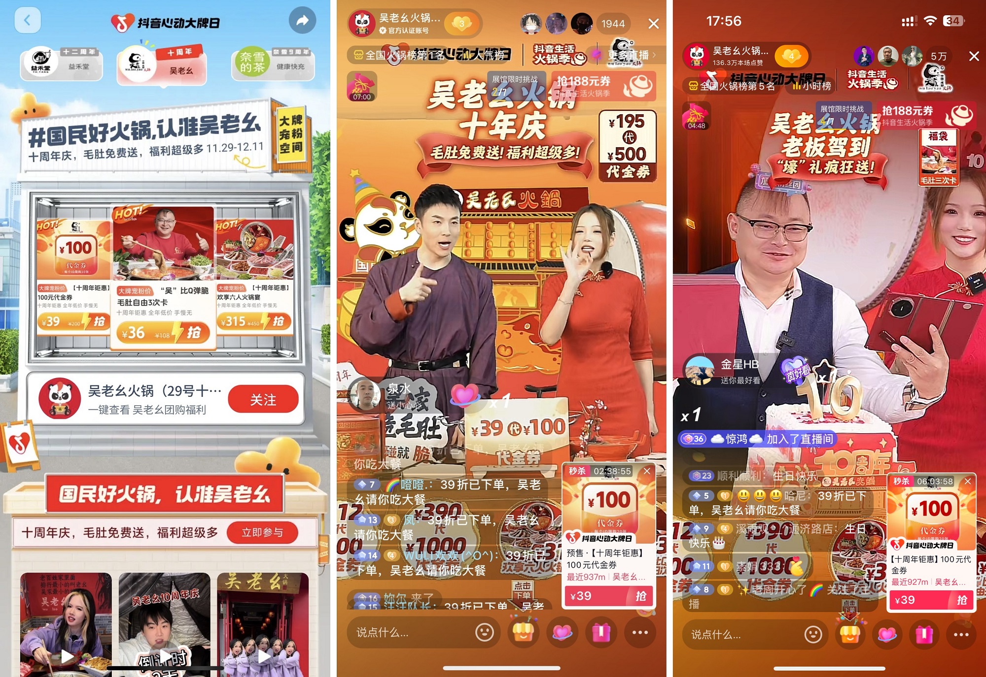 連鎖餐飲品牌吳老幺火鍋在十周年慶典之際,聯(lián)動「抖音心動大牌日」,于11月29日至12月12日,特別啟動“吳老幺十周年慶,毛肚免費送,福利超級多 ”主題活動。誠邀廣大用戶為品牌一同快樂慶生,并推出全年最低“39抵100”代金券這一超值福利,真誠回饋大家十年來對品牌的支持。在官方直播間內(nèi),品牌不僅通過非遺表演、川劇戲臺元素的創(chuàng)意布景,大場包小場滿足更多用戶的看播新鮮感,更依托系列寵粉動作展現(xiàn)品牌誠意:全年最優(yōu)折扣低至39折;爆品1折秒殺,可疊加套餐使用;不同梯度代金券、雙人餐/多人餐、小食/單品等豐富組品。另外,品牌創(chuàng)始人還將空降直播間,從萬斤毛肚餐品到優(yōu)惠免單券,甚至是實物周邊在內(nèi)的神秘福袋,驚喜福利放送不停。與此同時,線下還特別設(shè)立了快閃店,“隨機抽取小票尾號為5的用餐客戶贈送脆毛肚一份”的趣味互動玩法,給用戶的火鍋就餐消費帶去更多新鮮感和驚喜感。吳老幺此次周年慶線上下的一體式玩法,在寵粉的同時,通過年輕創(chuàng)意的玩法和用戶們玩在一起,不僅增加了用戶對品牌的年輕化認(rèn)知,超值的引流玩法,讓許多人的“第一次嘗試”成為無數(shù)次回購的起點。