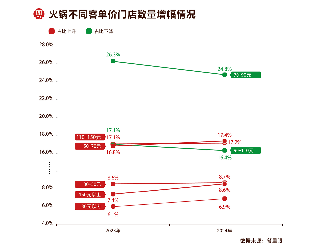 與此同時(shí),消費(fèi)者變得更加理性,開始重視品質(zhì)與價(jià)格,這導(dǎo)致火鍋市場(chǎng)的價(jià)格出現(xiàn)分化。一方面,重視性價(jià)比感知的消費(fèi)者推動(dòng)了小火鍋和自助火鍋流行;另一方面,中高價(jià)位的消費(fèi)者更加注重用餐品質(zhì)和體驗(yàn)。