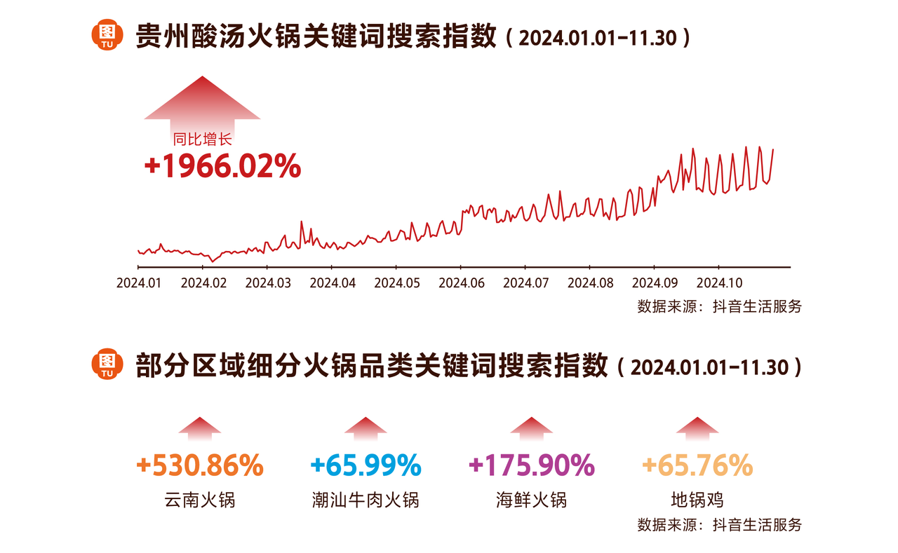 清湯和麻辣口味曾經(jīng)長期占據(jù)市場(chǎng)主流,隨著消費(fèi)者嘗鮮小眾口味的需求增長,細(xì)分火鍋品類正在崛起?!?024年火鍋行業(yè)消費(fèi)趨勢(shì)報(bào)告》顯示,海鮮火鍋、潮汕火鍋等細(xì)分品類關(guān)鍵詞搜索高漲。其中,貴州酸湯火鍋同比增長1966.02%,成為今年火鍋市場(chǎng)的“黑馬品類”。這種與地域特色緊密相關(guān)的細(xì)分火鍋品類,激發(fā)著消費(fèi)者“跨區(qū)域”打卡美食的熱情。